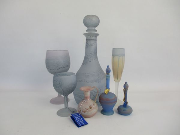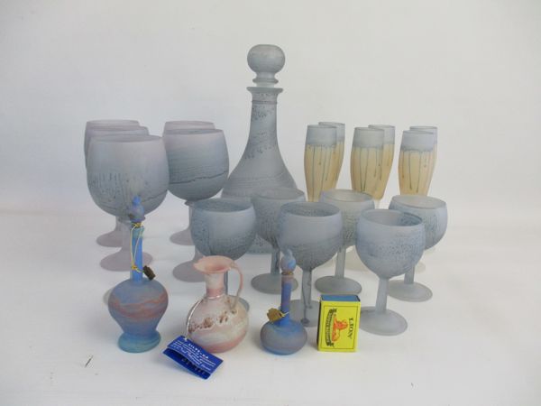 RUEVEN ART GLASS DECANTER, CHAMPAGNE & WINE GLASS SET