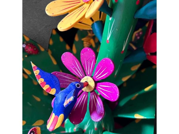 hand carved and painted wood sculpture of a blooming cactus with feeding birds and various insects.