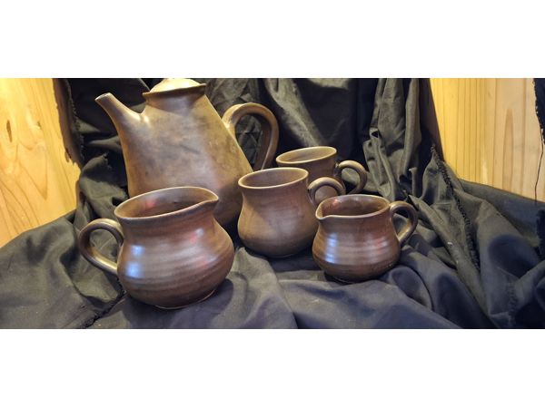 Vintage brown ceramic tea set including a teapot, three cups, and a milk jug.
