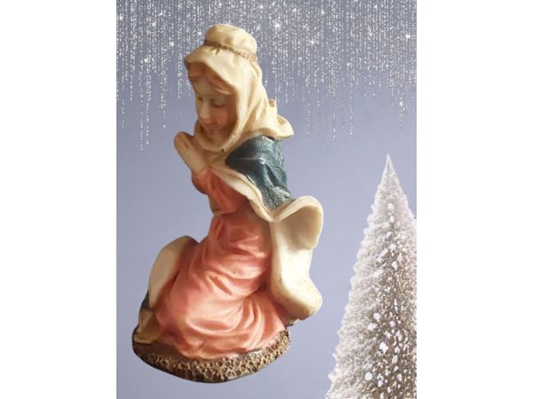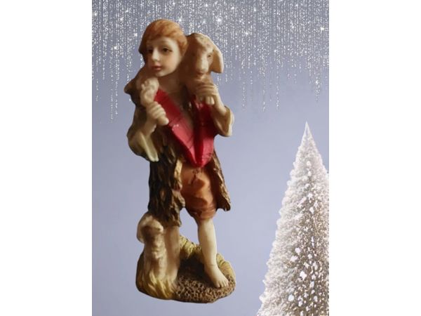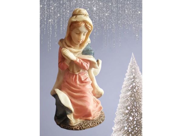 A manger, baby Jesus, Joseph, Mary, an angel, a shepherd and a sheep