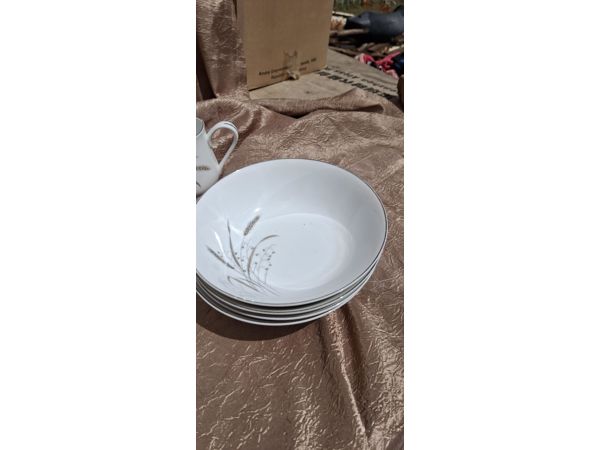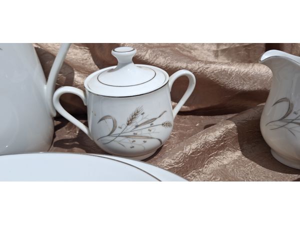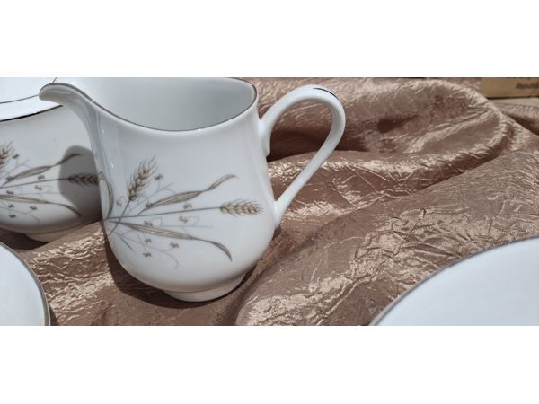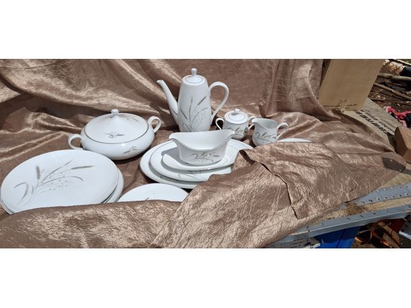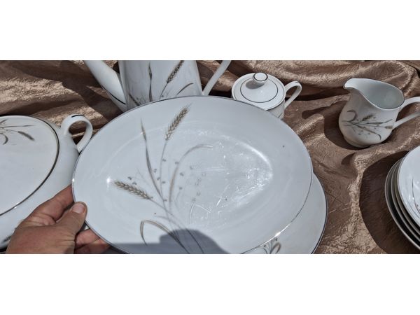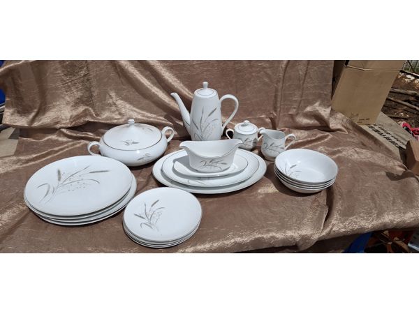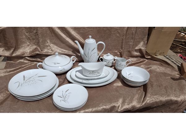 Includes teapot, sugar bowl, creamer, serving plates, soup bowls, and gravy boat
