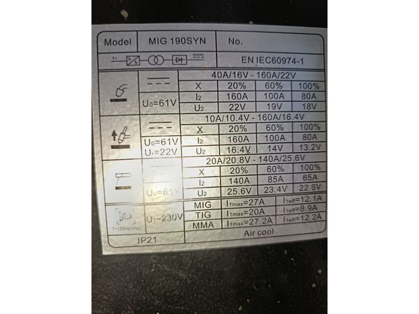 RILAND MIG 190SYN MIG Welder - Almost New Condition! A fantastic opportunity to acquire a high-quality MIG welder at a fraction of its original price! This welder comes from a business that has ceased operations and has seen very little use, making it almost as new. With its robust design and precise engineering, this MIG welder is perfect for: - Professional welding applications - Heavy-duty fabrication - Automotive repairs -