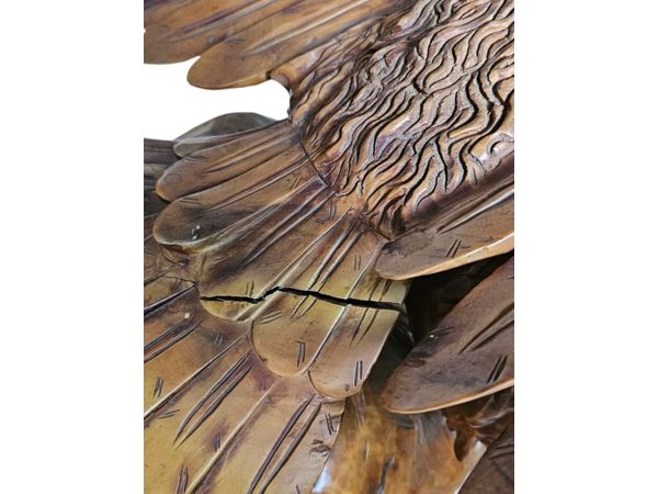 Hand-carved wooden sculpture depicting a detailed eagle poised on a tree stump.