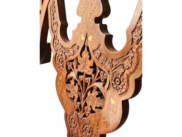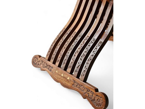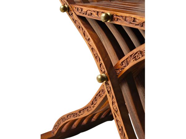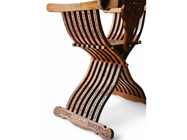 These chairs are made of solid wood, brass and bone inlay, and floral carvings. Great statement pieces to show off or tuck in a corner. These carved Savonarola folding chairs are solid with ornate paneling and brass inlay. Once you loosen the middle pole connecting the front to the back panel, the backrest slides off and allows the chair to be folded up.