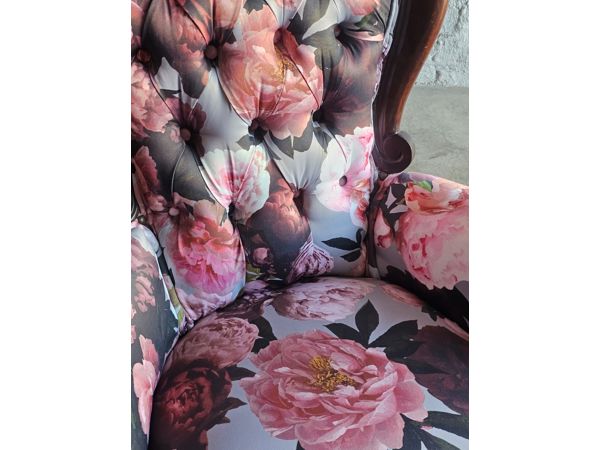 Upholstery: Floral pattern in pink hues with studded trim detailing.