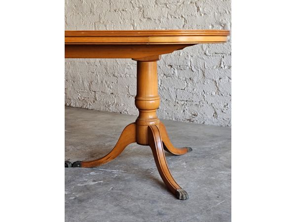 Wood dining table featuring a leather inlaid top with decorative trim.
