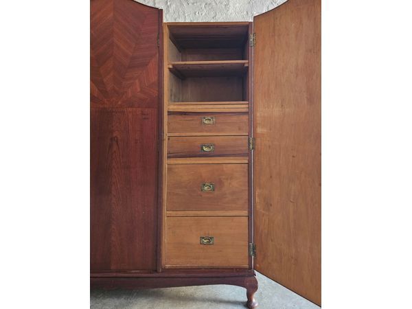 Additional Details:Boasting a sturdy base with elegantly carved legs, this piece features three doors. One door conceals four sliding drawers and two compartments, while the remaining two doors provide ample space for hanging clothes.