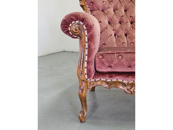 Victorian style settee, featuring elegant carved wooden frame and luxurious pink tufted upholstery.