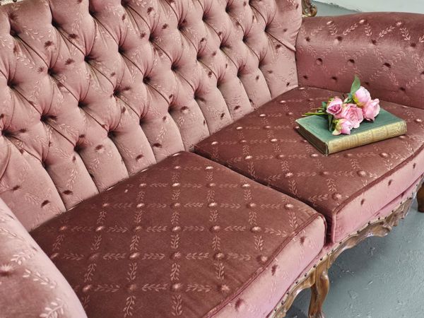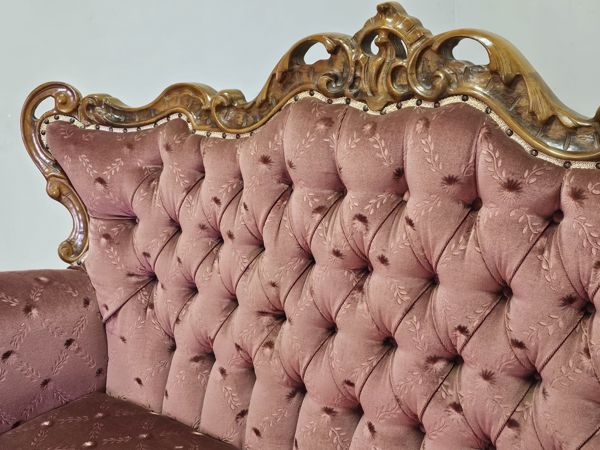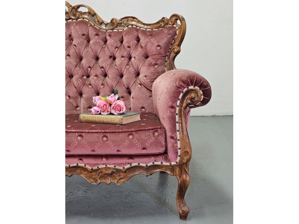 Victorian style settee, featuring elegant carved wooden frame and luxurious pink tufted upholstery.