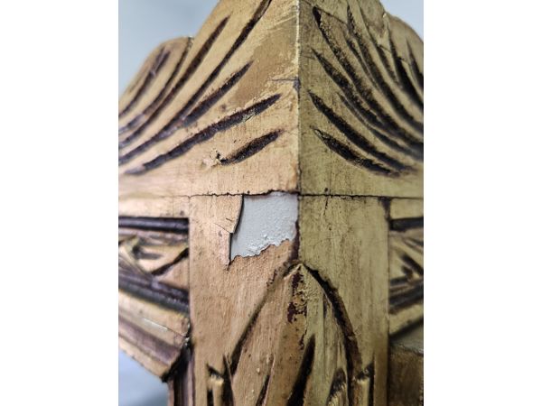 Design: This is a hand made and carved item with gilded features to give it an Antique look, with Glass sides and front with intricate carved details.