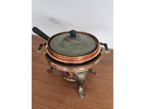 Antique Dutch round Copper Pan and Dish on Burner Stand