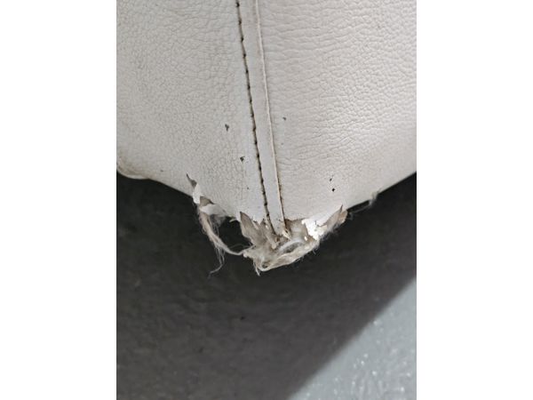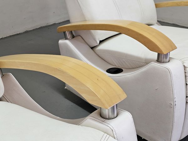 Condition: Fair. The leather exhibits noticeable wear, including areas of peeling and a few small holes. Additionally, one recliner’s footrest mechanism is faulty and does not extend as it should-and needs TLC.
