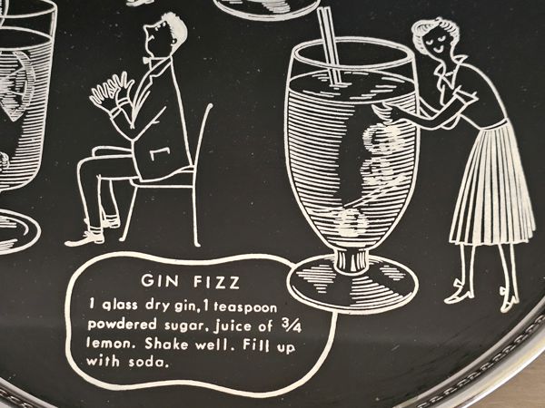 The set showcases a striking black and silver design, with both the tray and coasters featuring illustrations of classic cocktails such as "Dry Martini," "Gin Fizz," and "Whisky Sour."