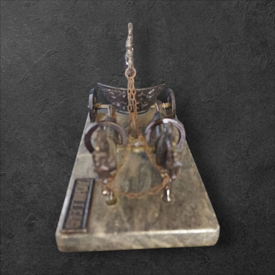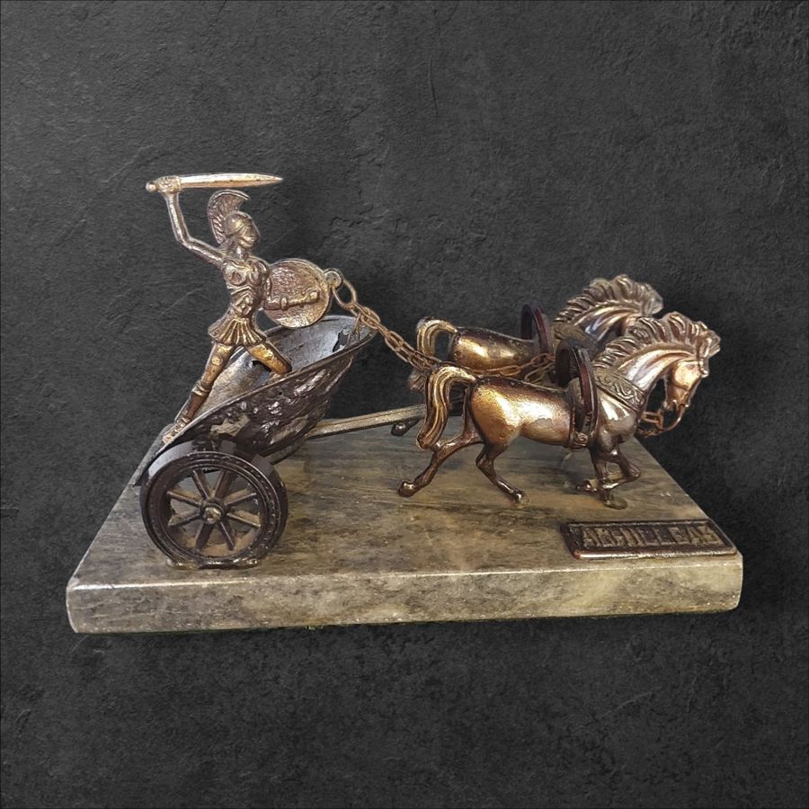 Bronze sculpture of a Roman charioteer with two horses on a marble base.
