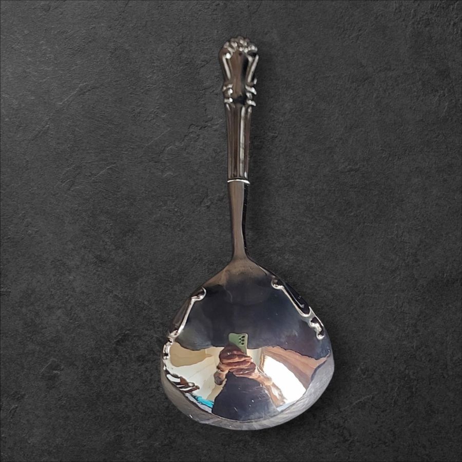 Antique silver-plated gravy ladle featuring a decorative handle and deep, rounded bowl. Ideal for serving gravies or sauces. Excellent vintage condition with minimal wear consistent with age. Perfect for collectors or for enhancing table settings.
