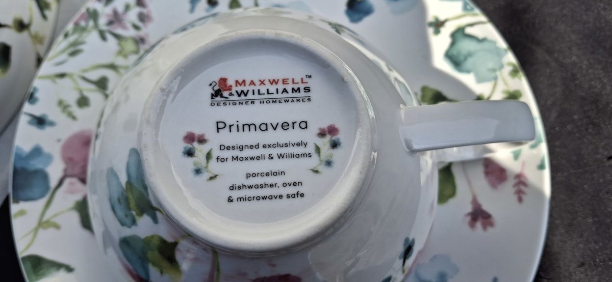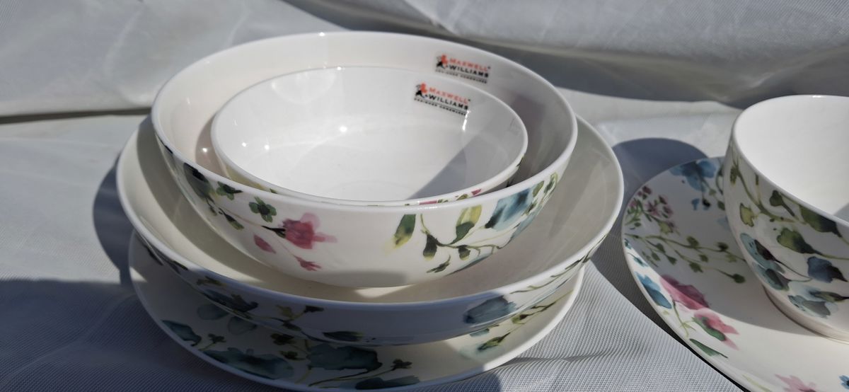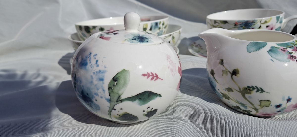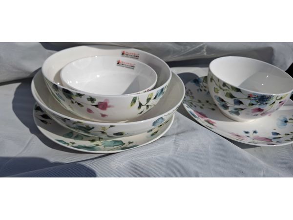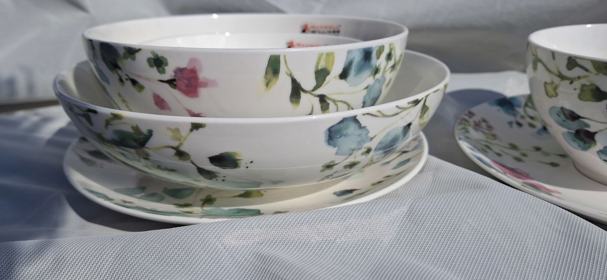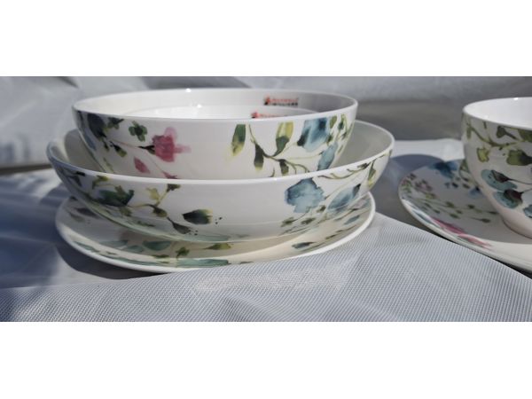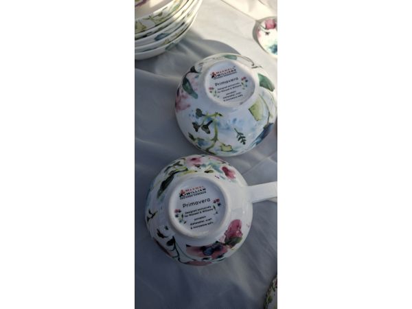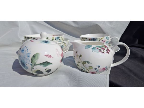 Components: Includes cups, saucers, bowls, sugar bowl, and creamer (Six Placements)