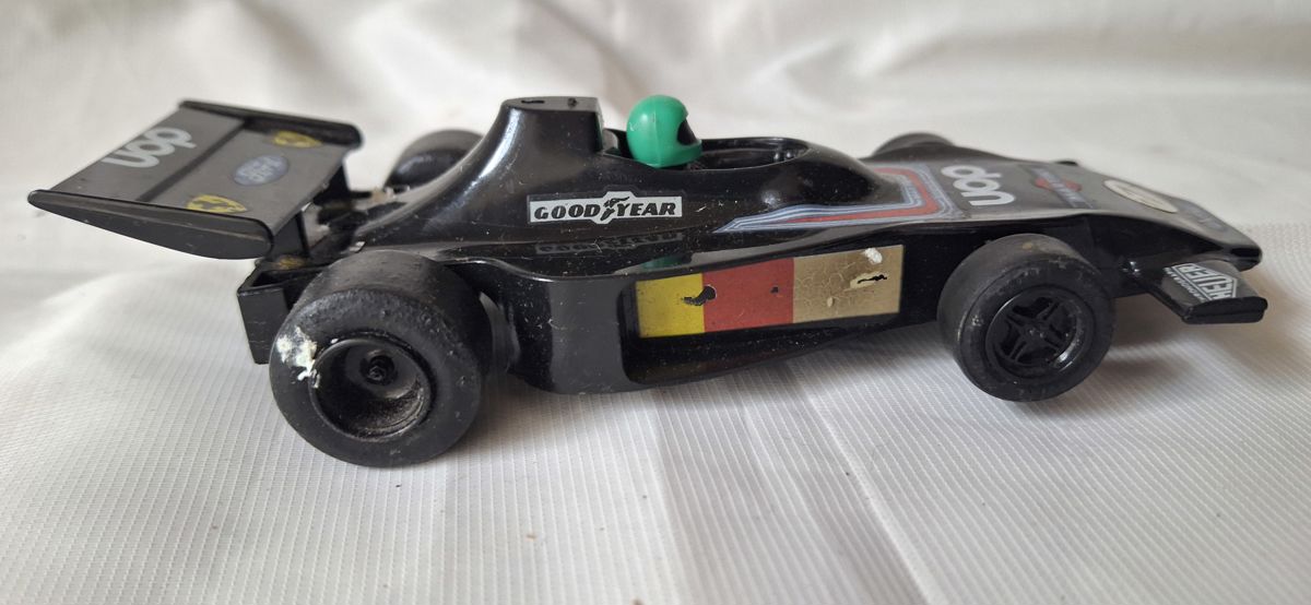 Vintage UOP Shadow slot car model featuring a black livery with iconic sponsor decals.