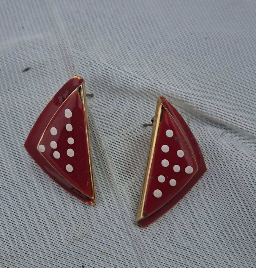 Vintage red geometric clip-on earrings with gold-tone accents and polka dot design.