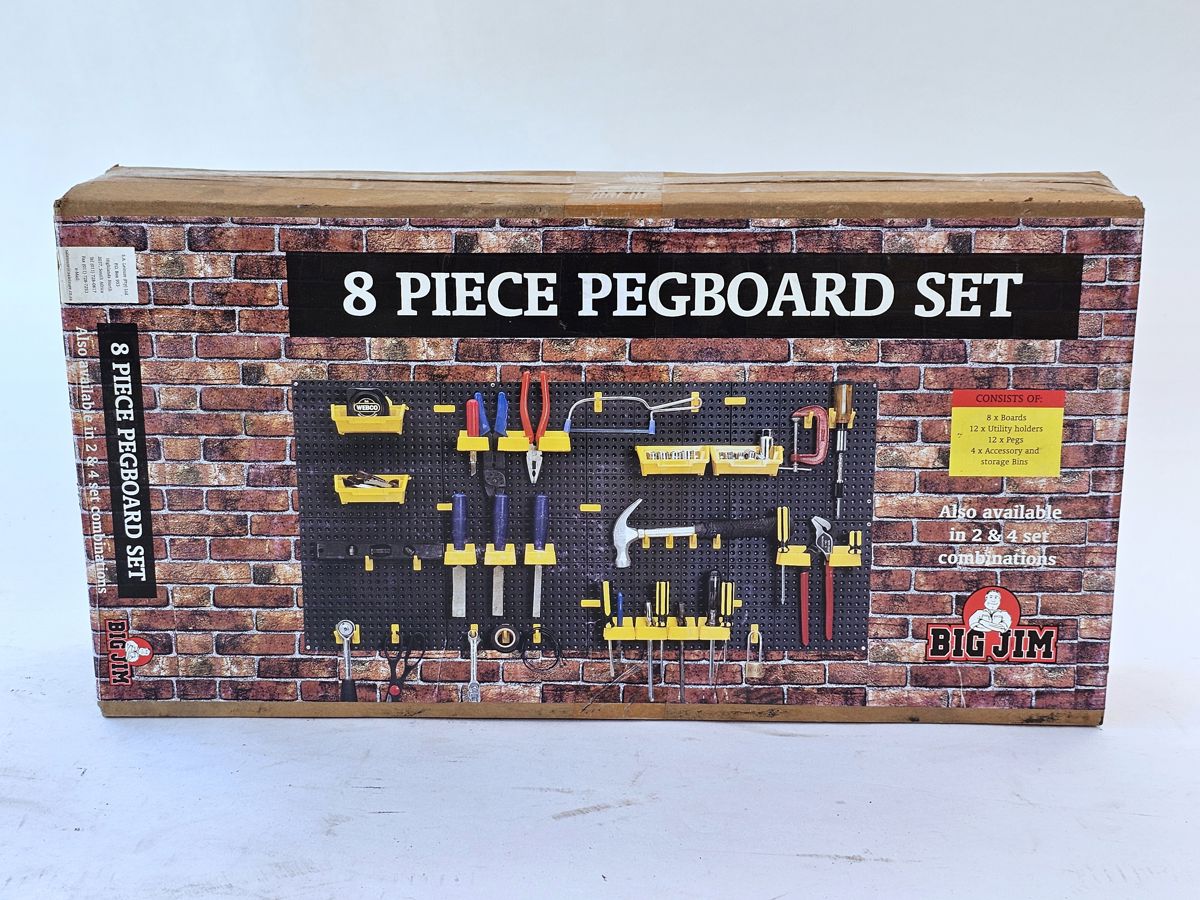 Never Used Big Jim 8 Piece Pegboard Set Includes 8 x Boards , 12 Utility Holders , 12w x Pegs , 4 Accessory and Storage Bins