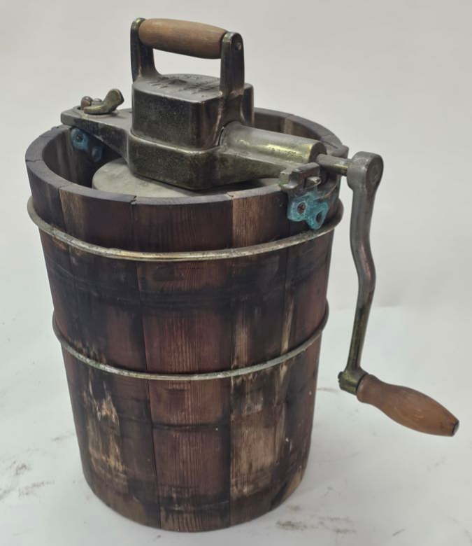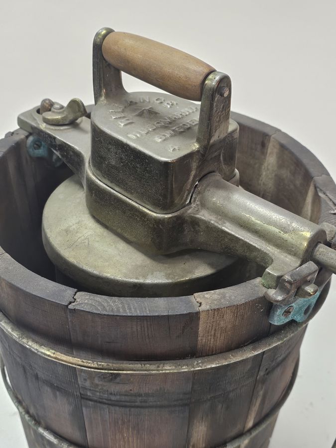 a classic wooden bucket ice cream maker with a hand-crank mechanism. The device has a rustic wood finish and a metal churning apparatus, making it a functional collectible and a charming piece of Americana. Perfect for a vintage kitchen display, historical enthusiast, or anyone looking to make homemade ice cream the traditional way.