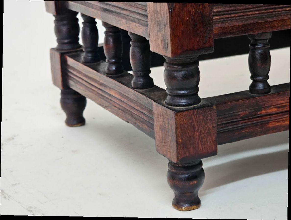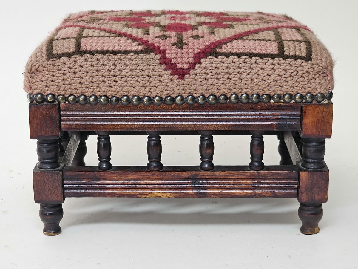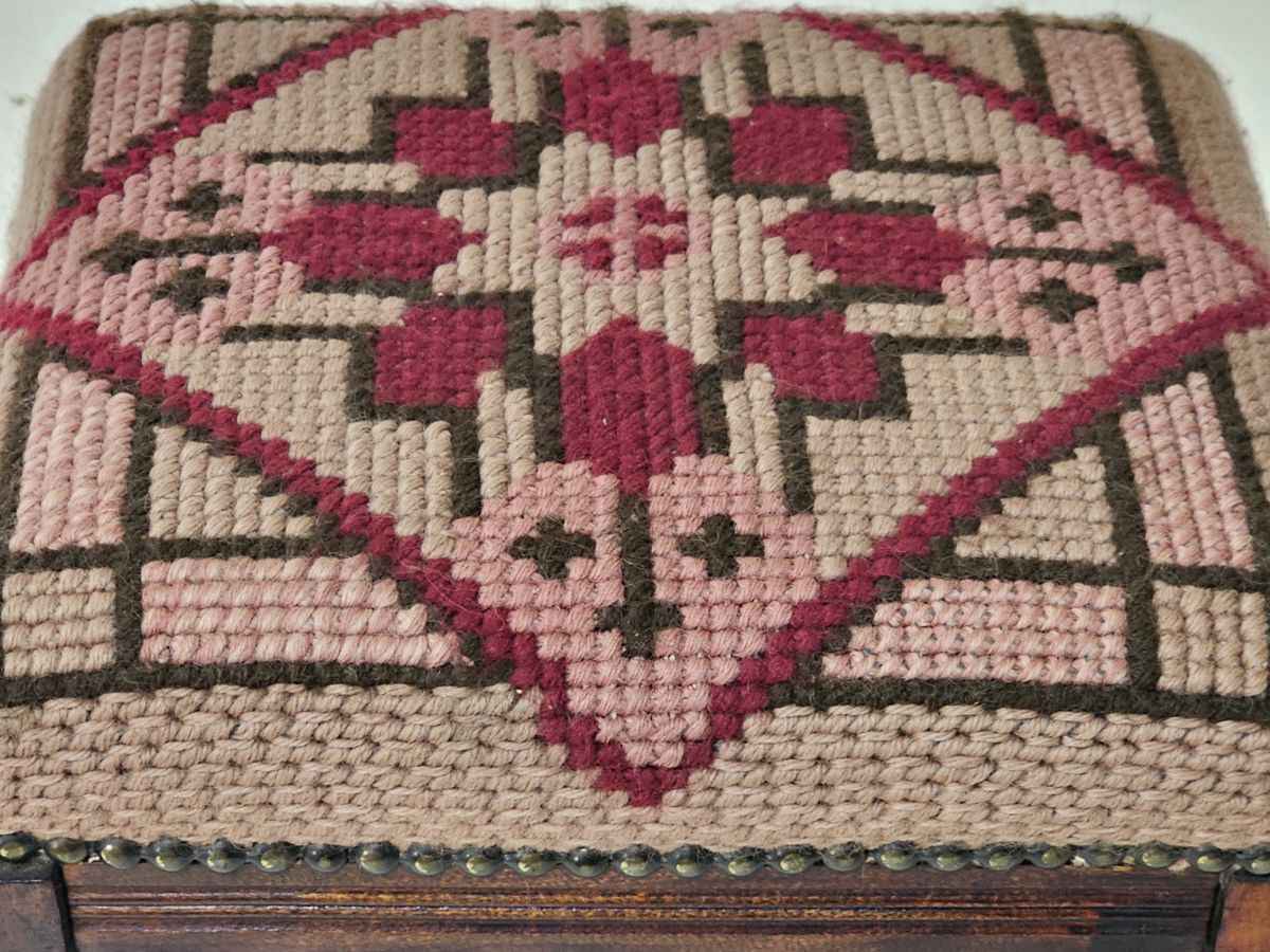 A charming vintage footstool with a solid wooden base. The top is a thick, hand-stitched needlepoint cushion with a beautiful geometric and floral pattern in shades of pink, red, and brown. It's a classic piece that would add a cozy, traditional touch to any room. Perfect for use as a footrest or a decorative accent.