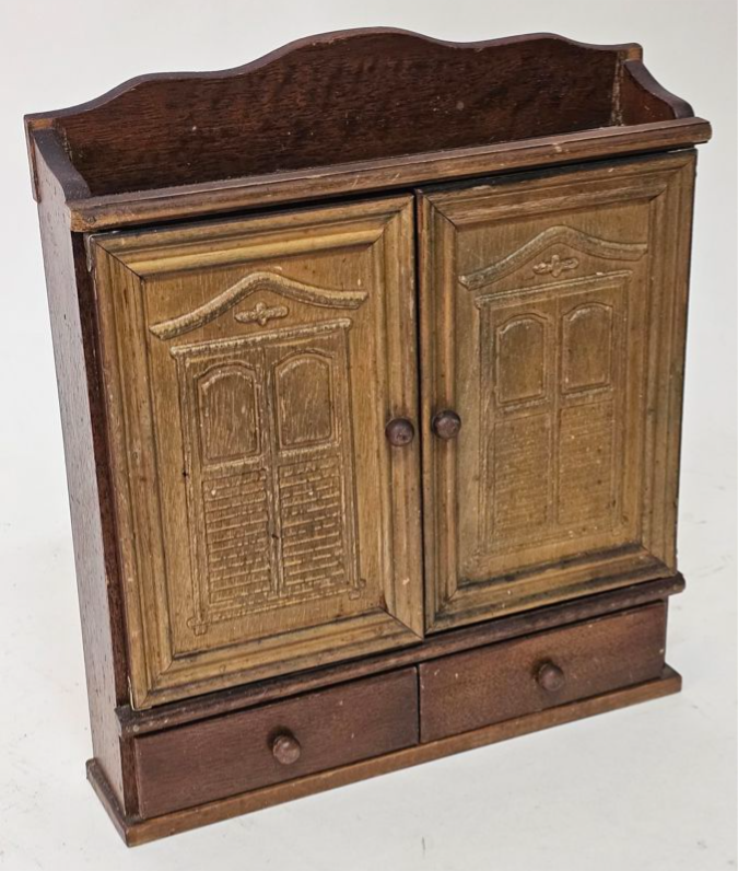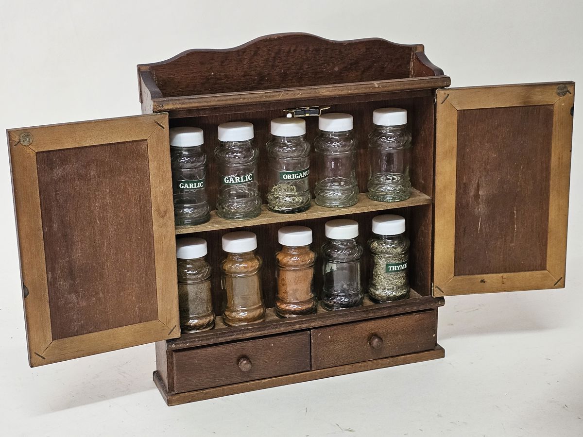 a Charming vintage wooden Spice shelf, perfect for storing spices or other small items. It has a rustic, distressed finish and two doors with a carved shutter design. The bottom of the cabinet includes two small drawers, providing extra storage. This piece is ideal for adding a touch of country charm to a kitchen countertop or for mounting on a wall.