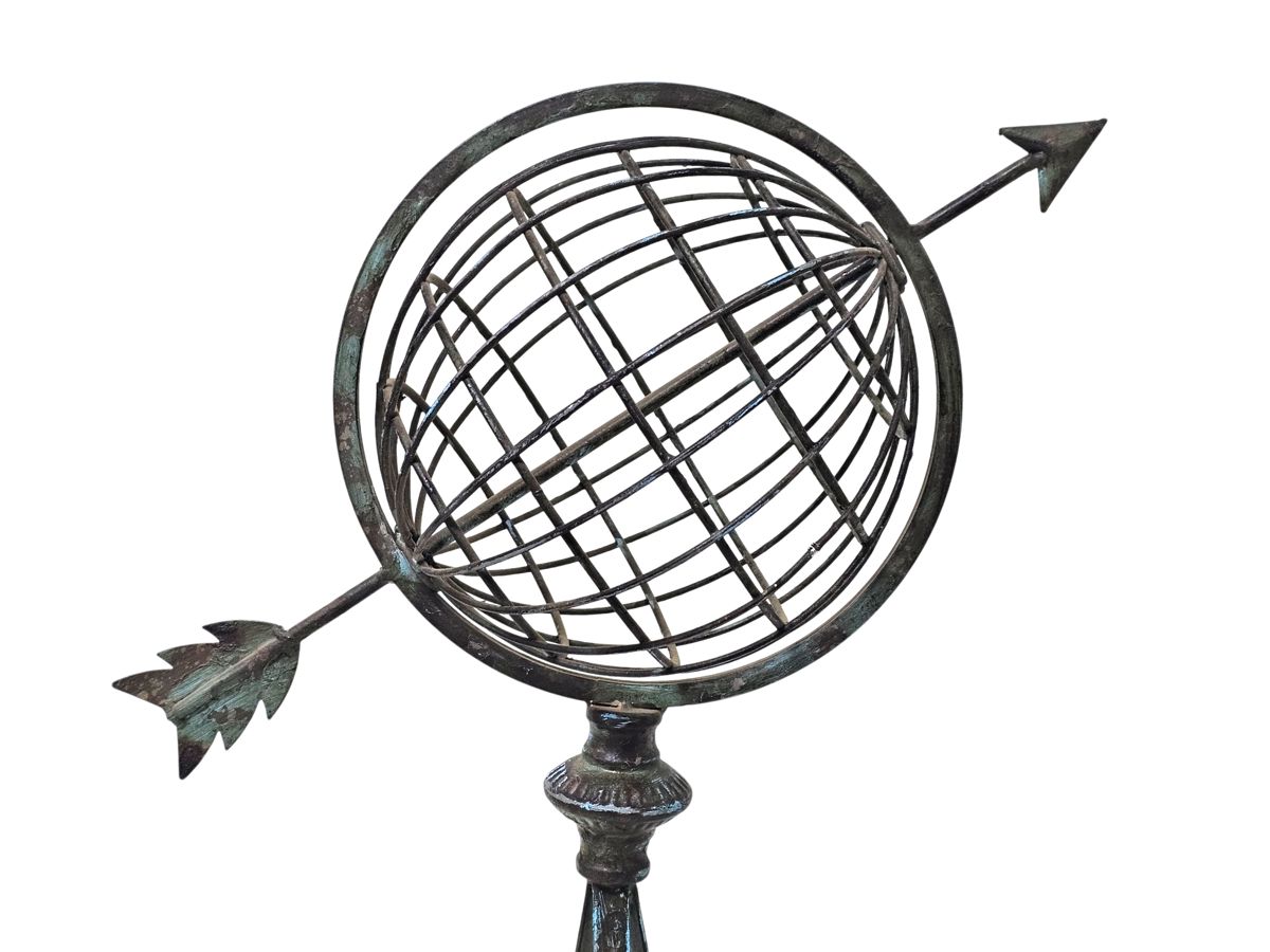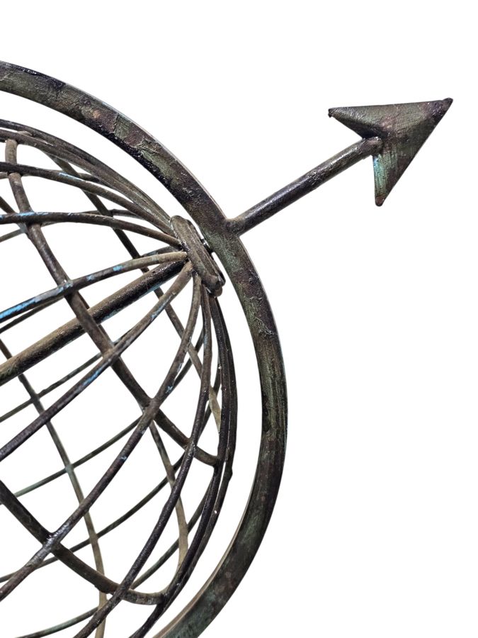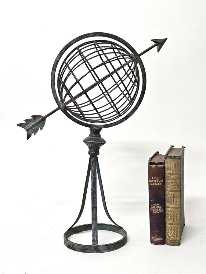 A striking decorative metal armillary sphere. The piece features a classic celestial design with an arrow passing through the center, all supported by an elegant stand. The metal has a beautiful distressed and aged verdigris finish, giving it a timeless, vintage appearance. It is a substantial and eye-catching piece, perfect for a collector of scientific instruments or for adding a touch of classic, intellectual charm to any room.