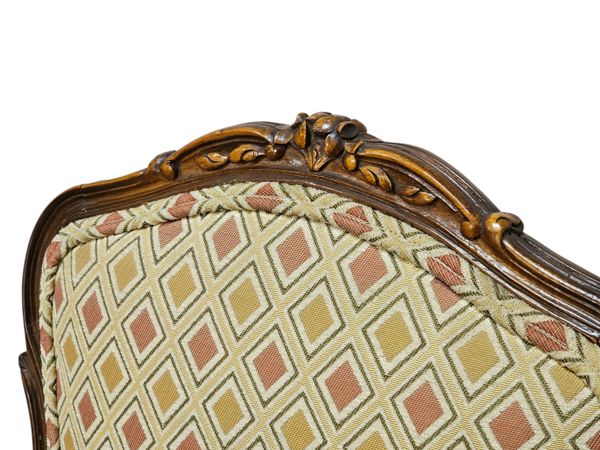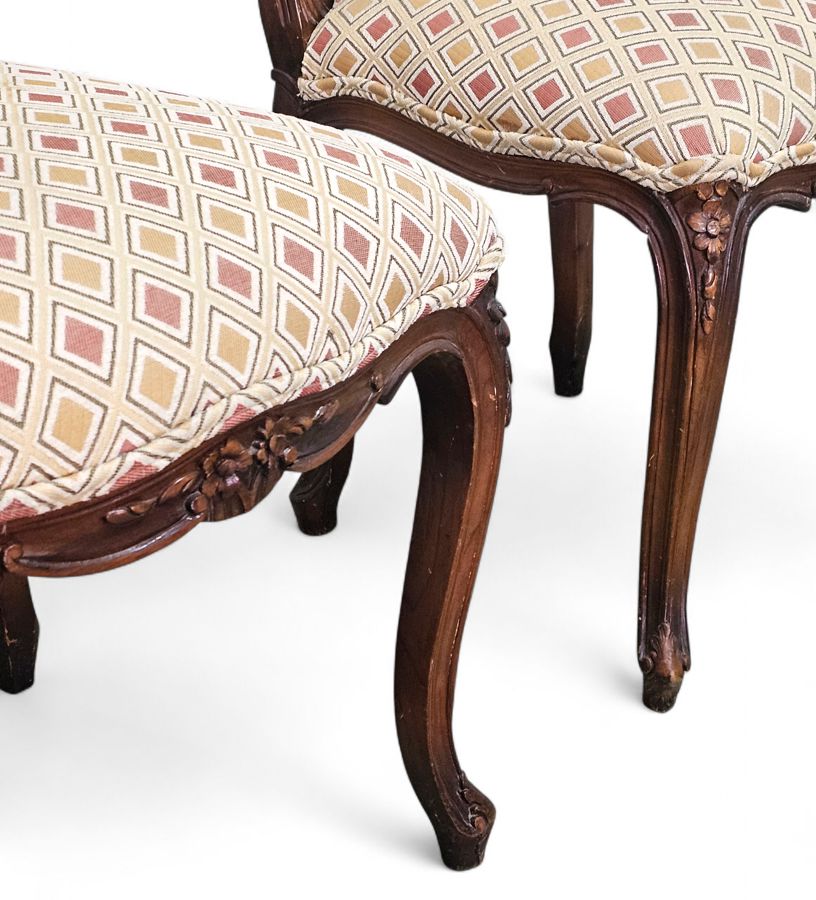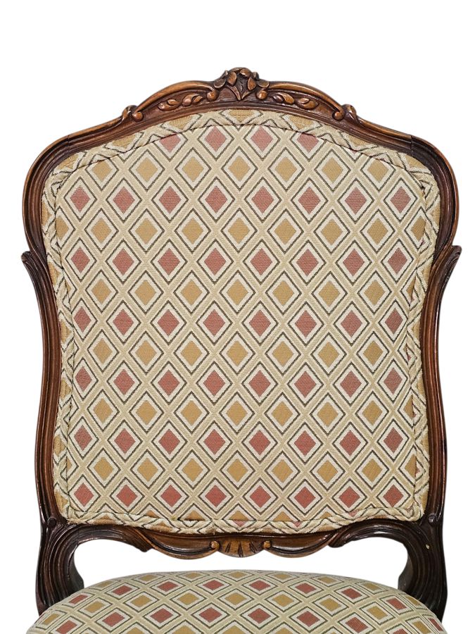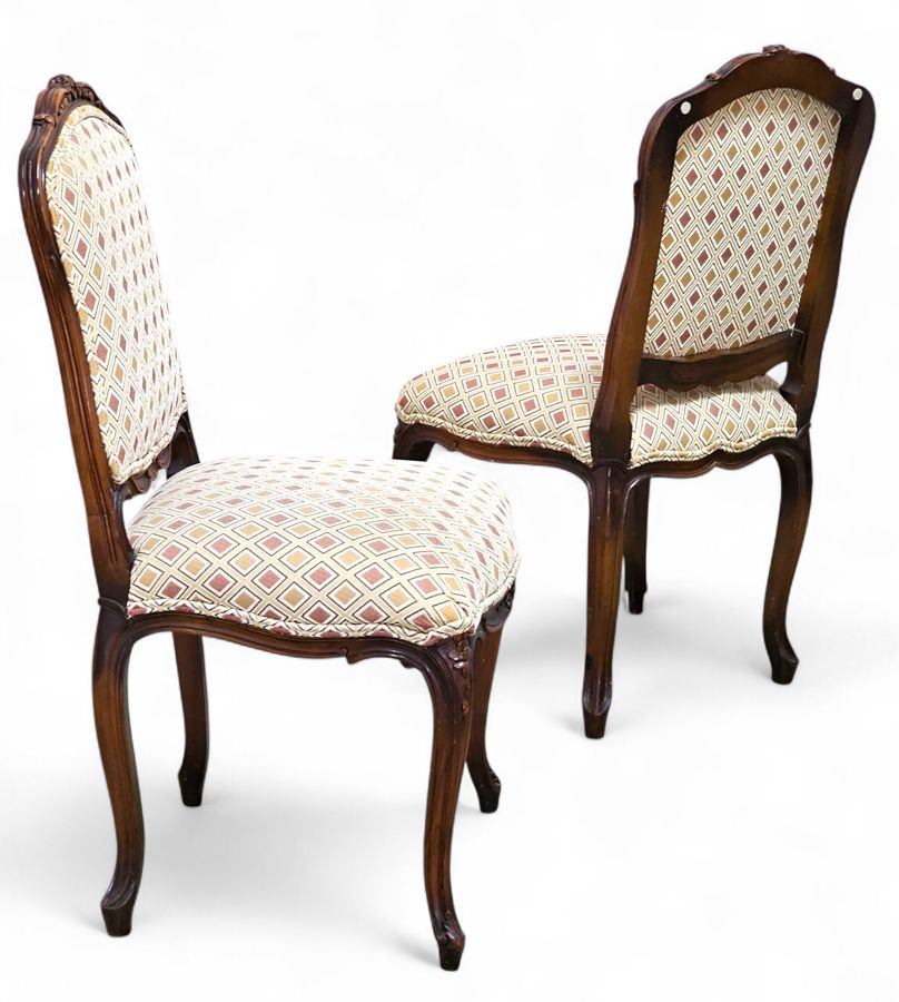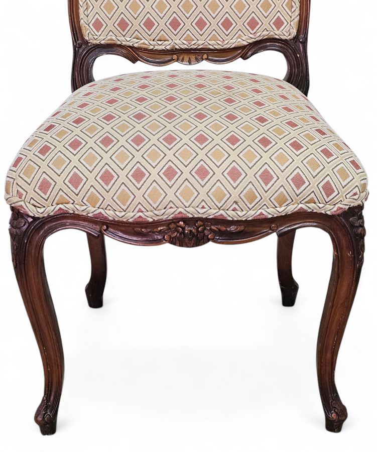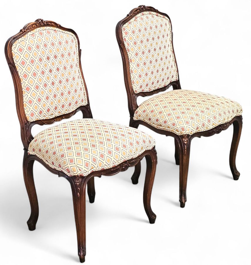 This auction features a beautiful pair of vintage dining chairs crafted in the classic Louis XV style. Each chair has a dark wood frame with elegant carved details on the top rail and gracefully curved cabriole legs. The chairs are upholstered in a light-colored diamond-patterned fabric. These pieces are perfect for adding a touch of sophisticated, French-inspired elegance to a dining room, bedroom, or entryway.