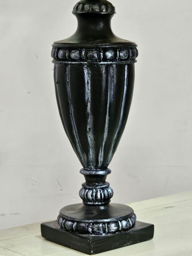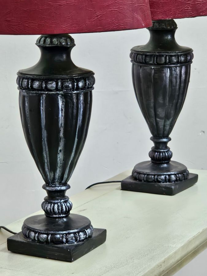 A striking pair of urn-shaped table lamps. The lamps have a detailed, classical design with a dark, distressed finish, highlighted by a subtle dark patina on the raised decorative elements. Each lamp is topped with a rich, burgundy-red shade, creating a bold, elegant look. This pair would be a sophisticated addition to a living room, dining room, or bedroom.