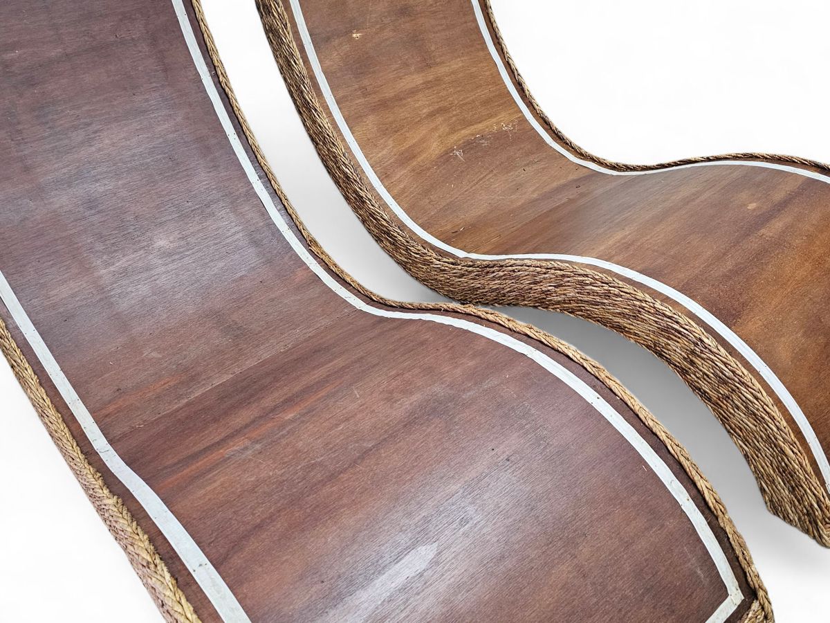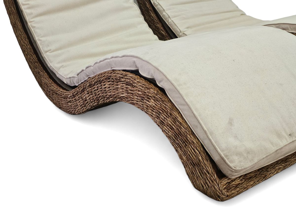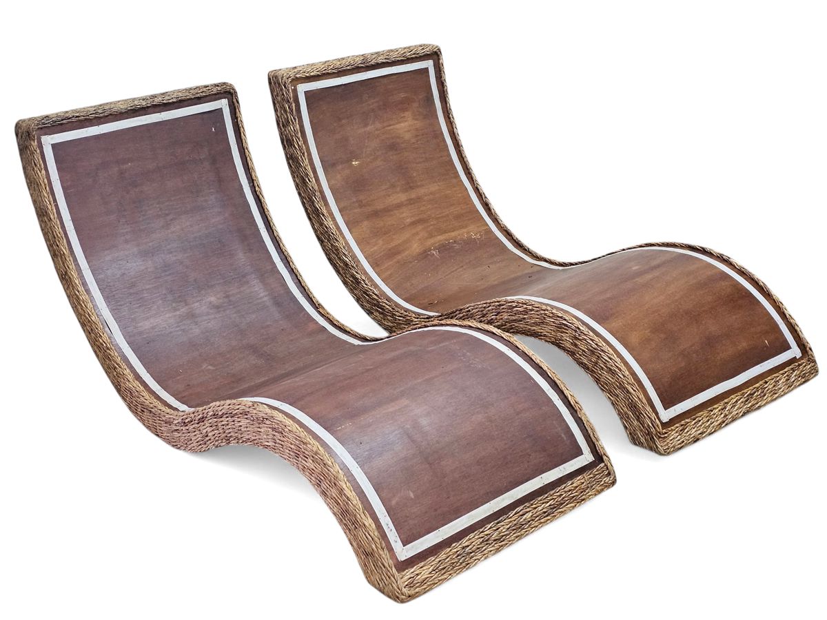 A pair of curved chaise lounge chairs with a woven wicker and wood frame and removable cream-colored cushions.