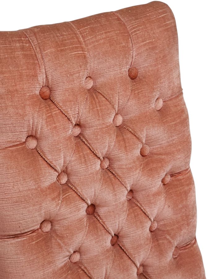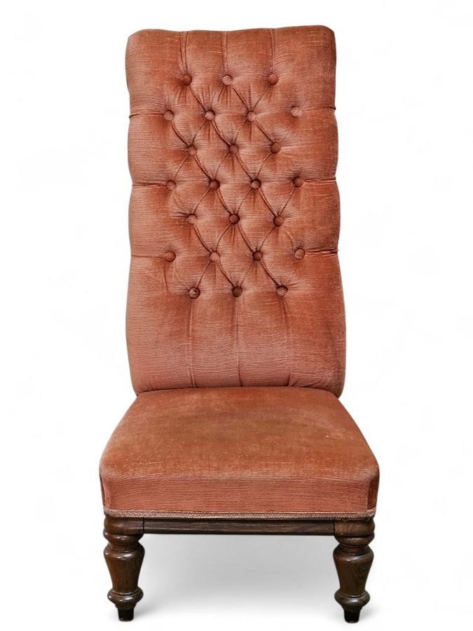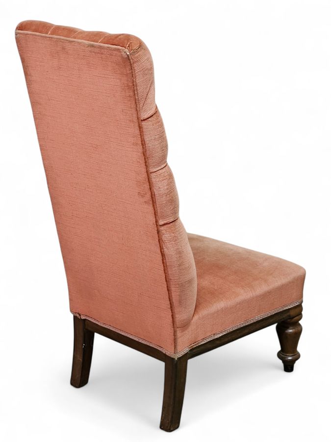 The low seat also made it easier for a woman to put on her shoes and stockings. Additionally, chairs of this era often had a lower seat to accommodate women's voluminous skirts. The chair features a deep buttoned, high back and a sprung seat, which is upholstered in a salmon or rose-colored fabric. The frame is made of dark wood with turned legs at the front. The 48cm(w) x 60cm(d) x 98cm(h)