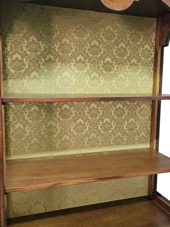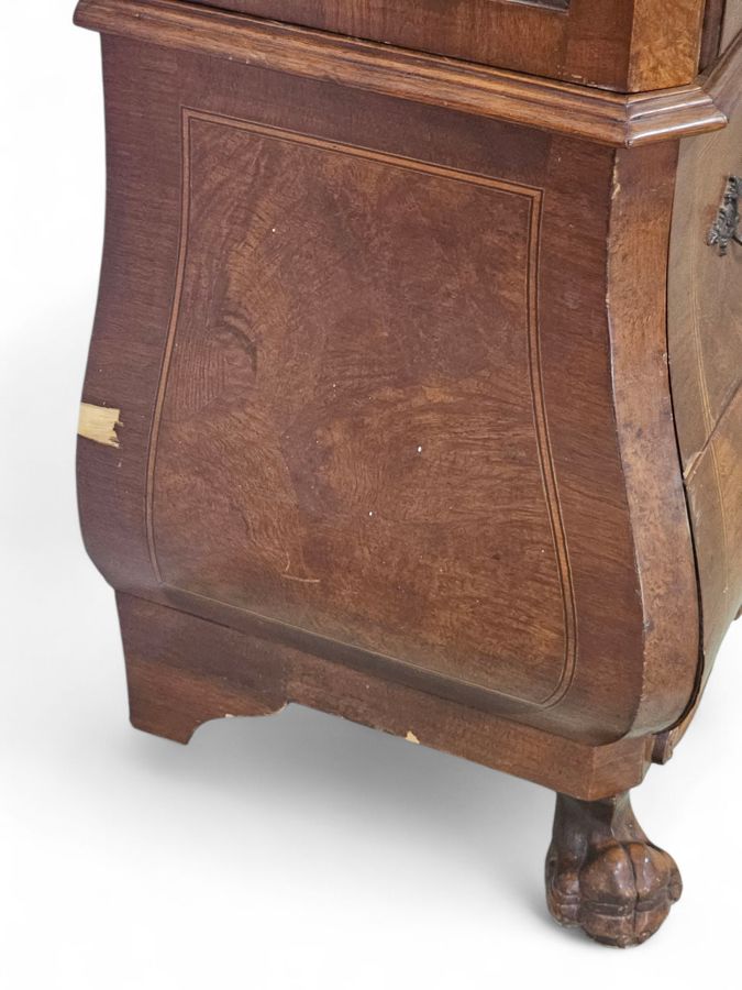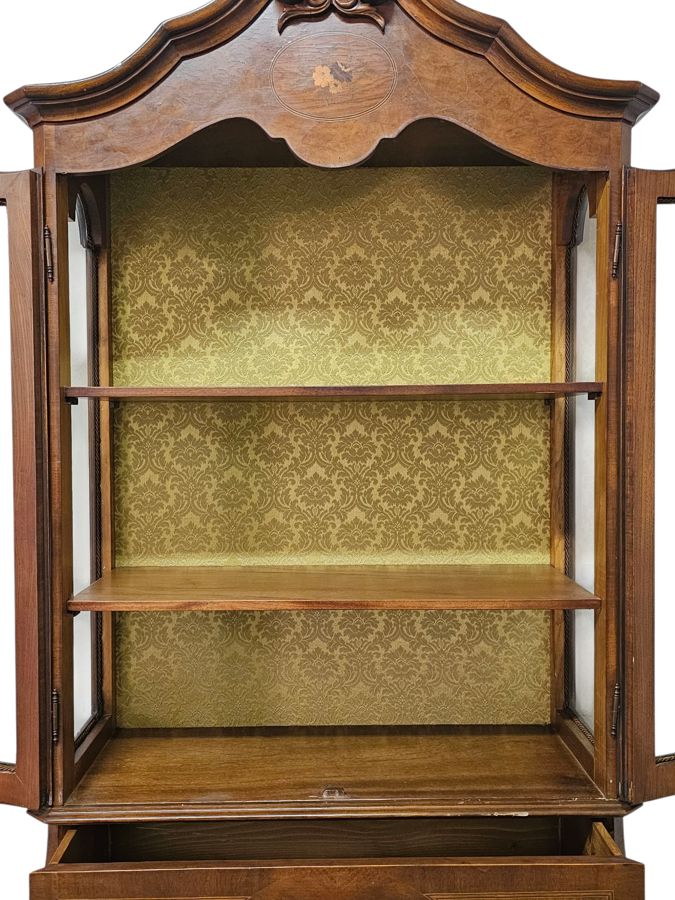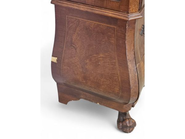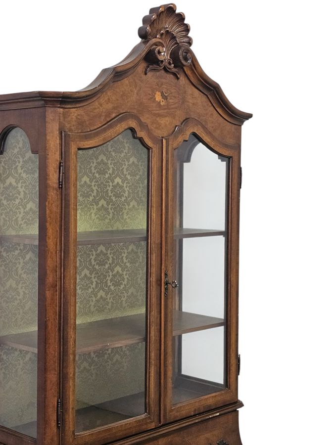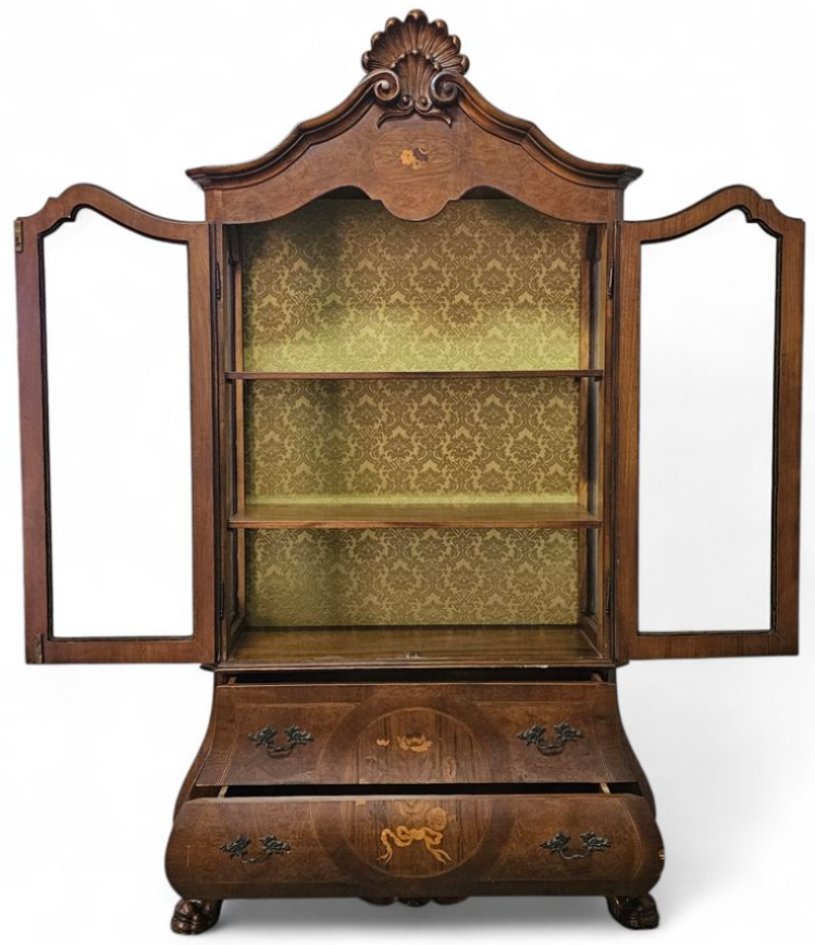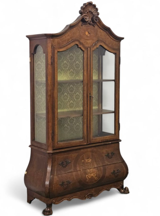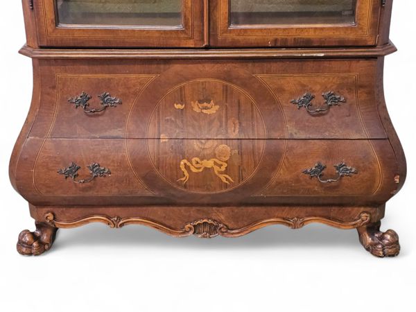 This impressive two-part cabinet features a gracefully shaped cornice with a central carved rococo shell motif. The upper display section has a pair of astragal glazed doors, each with a carved crest, revealing a lined interior with shelves. The lower part is a bombe-shaped chest of drawers with two full-width drawers and two smaller drawers, all adorned with intricate floral marquetry inlays. The piece is raised on four carved claw feet. The cabinet is constructed from walnut and burl walnut veneers, and the marquetry is created using a variety of woods to form scrolling floral and other decorative motifs. The given dimensions are approximately 115 cm (w) x 46 cm (d) x 215 cm (h). A condition note should mention that the cabinet needs a back support leg.