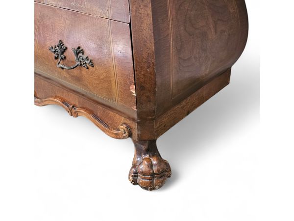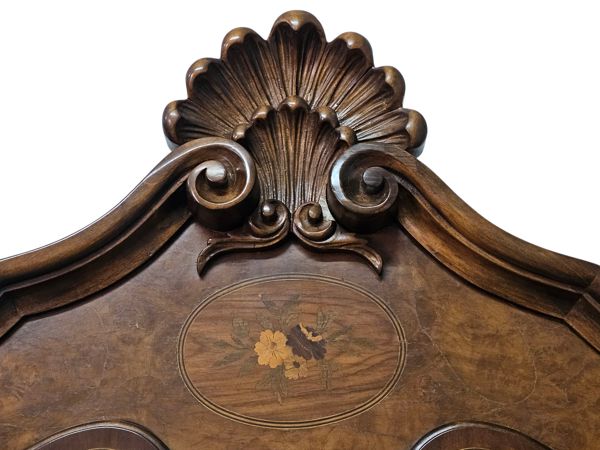 Due to the use of veneering and elaborate marquetry, this cabinet is characteristic of the Baroque or Rococo revival period, which was popular in the 19th century.