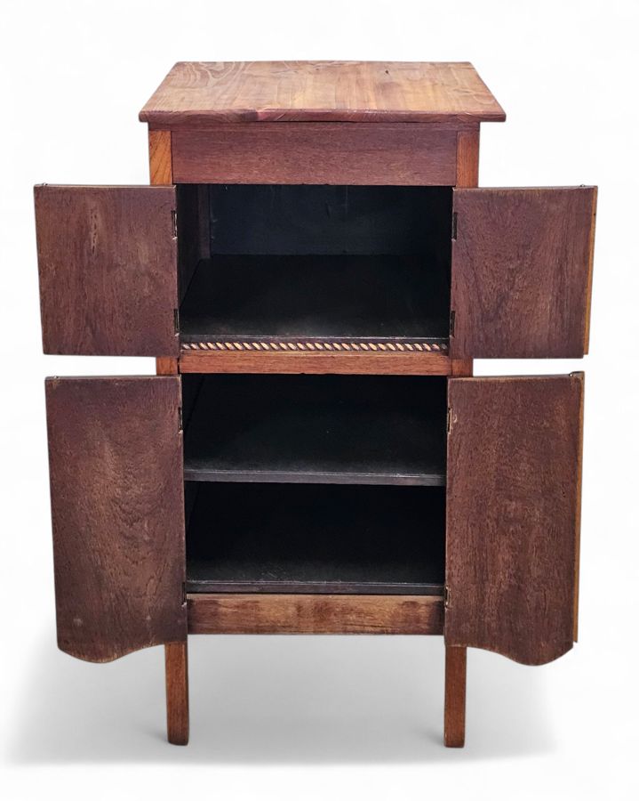 This piece features a square combination of different wood, two pairs of doors. The cabinet stands on four tapered legs with a subtle wave-cut apron door detail on tje doors.