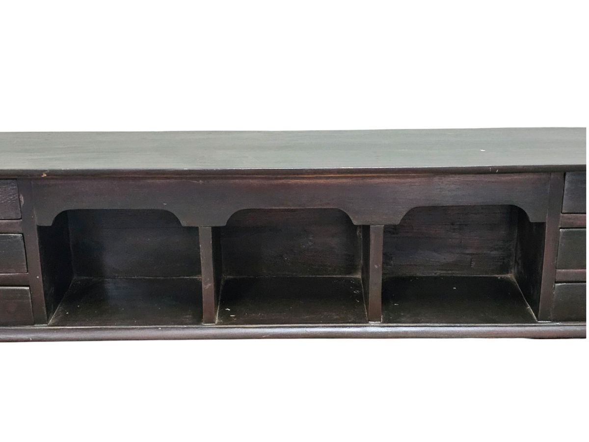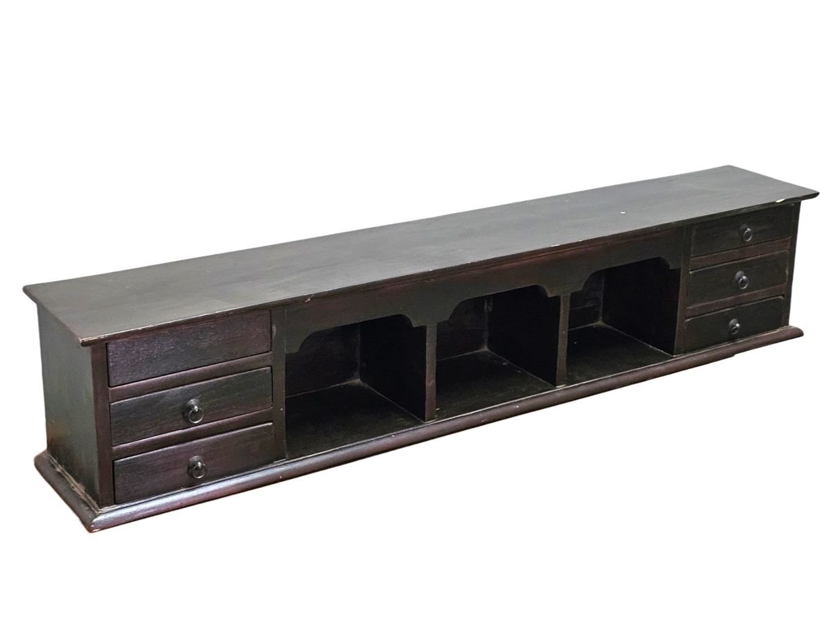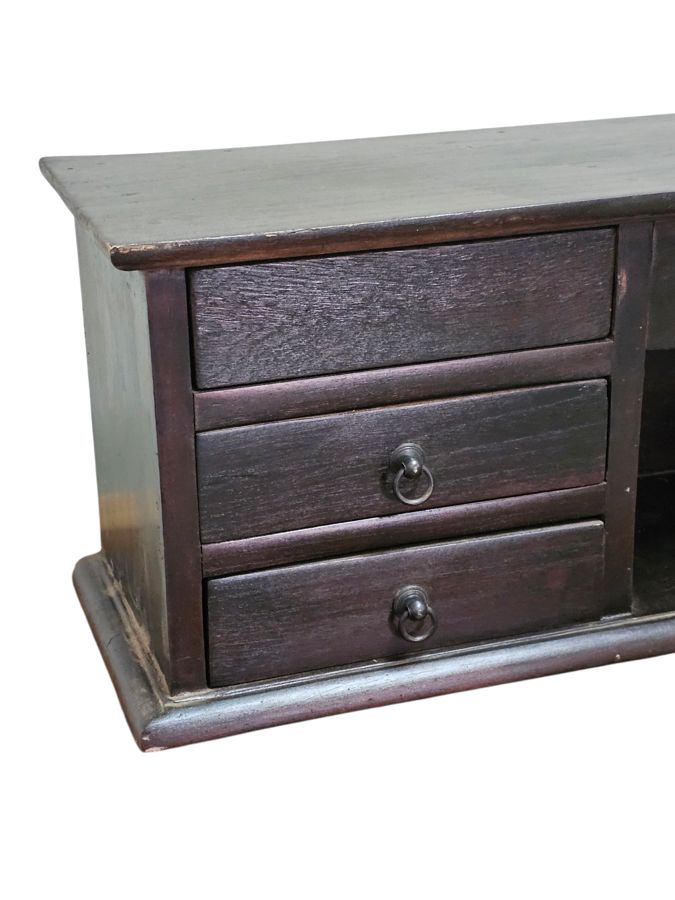 This is a handcrafted, dark brown tabletop cabinet of Chinese origin, designed to provide additional storage and display space on top of a table or other flat surface. The piece features a central section with three open cubbies, flanked on each side by three stacked drawers. The drawers are adorned with simple, circular metal pulls. This versatile cabinet is an ideal piece for organizing items in a hallway, office, or living room.