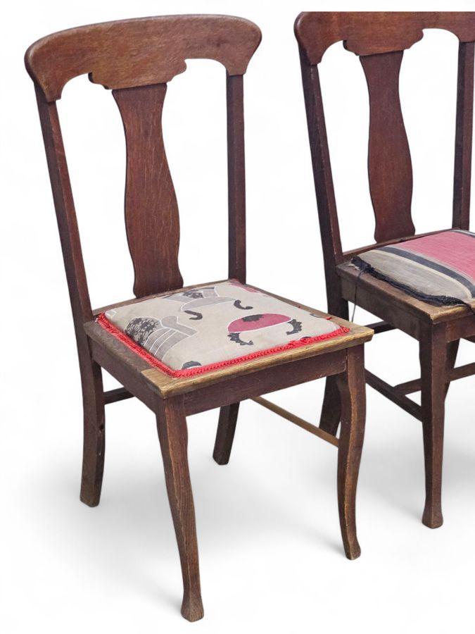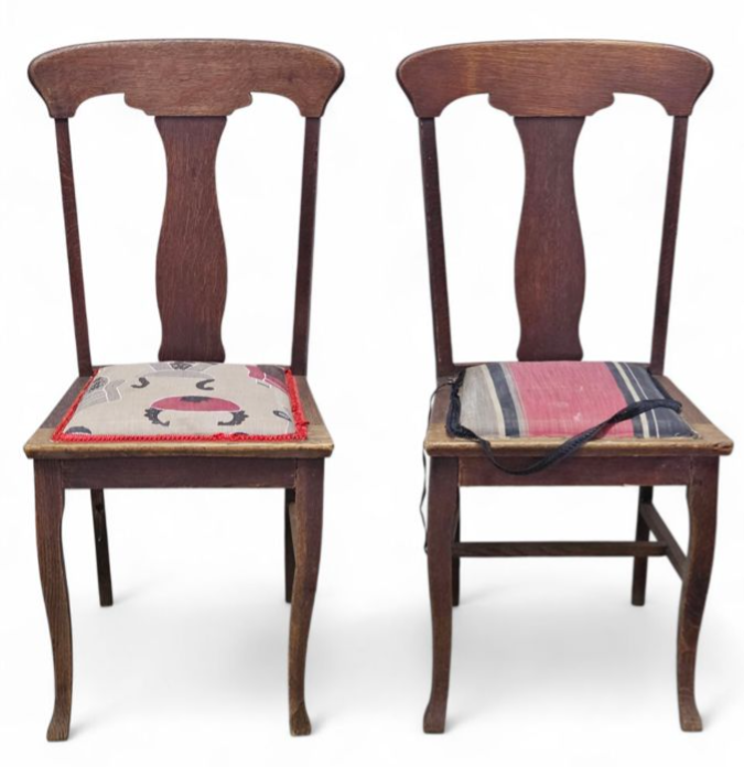 This pair of vintage wooden chairs features a fiddle-shaped splat back, with each chair having a different upholstered drop-in seat. The chairs are of American origin, 20th century.