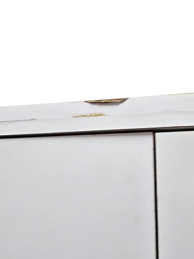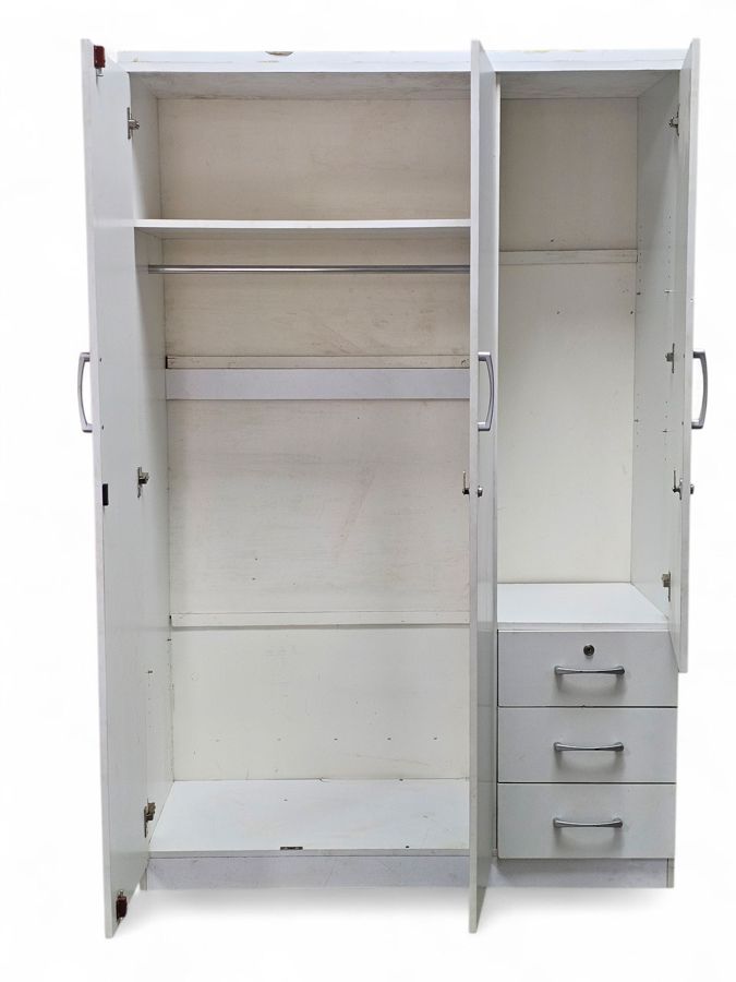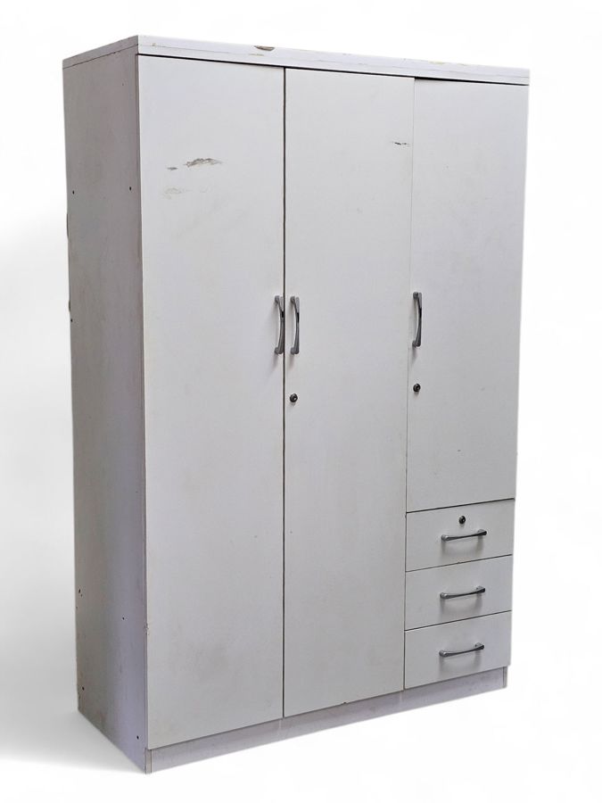 The exterior of the wardrobe shows signs of wear and tear, including scuffs and small areas where the paint is chipped, consistent with use