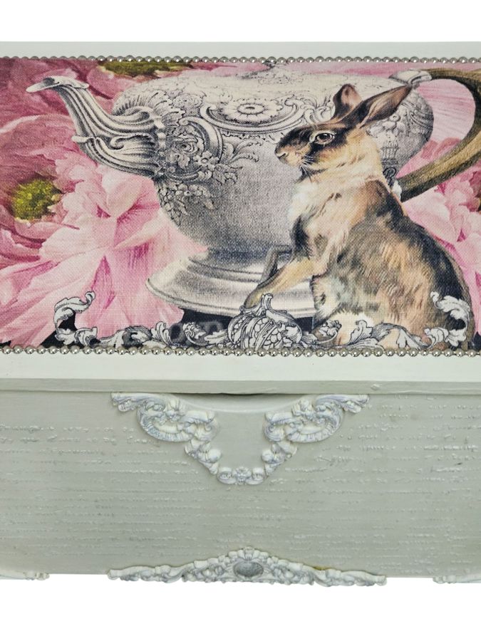 It features a painted frame with an aged or distressed finish, decorated with script-like text on the front and sides. The hinged lid is upholstered in a fabric with a Rabbit & floral pattern.
