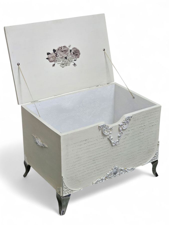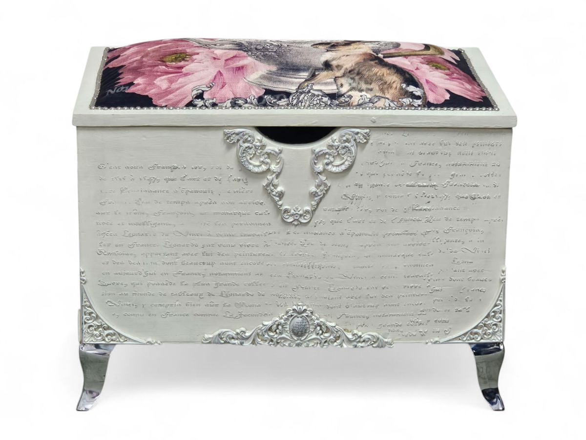 The piece is supported by ornate carved details and cabriole-style chrome legs, giving it a classic, vintage-inspired look. This versatile kist would be an attractive and practical addition to a bedroom, living room, or entryway, serving as a blanket box, extra seating, or a decorative accent.