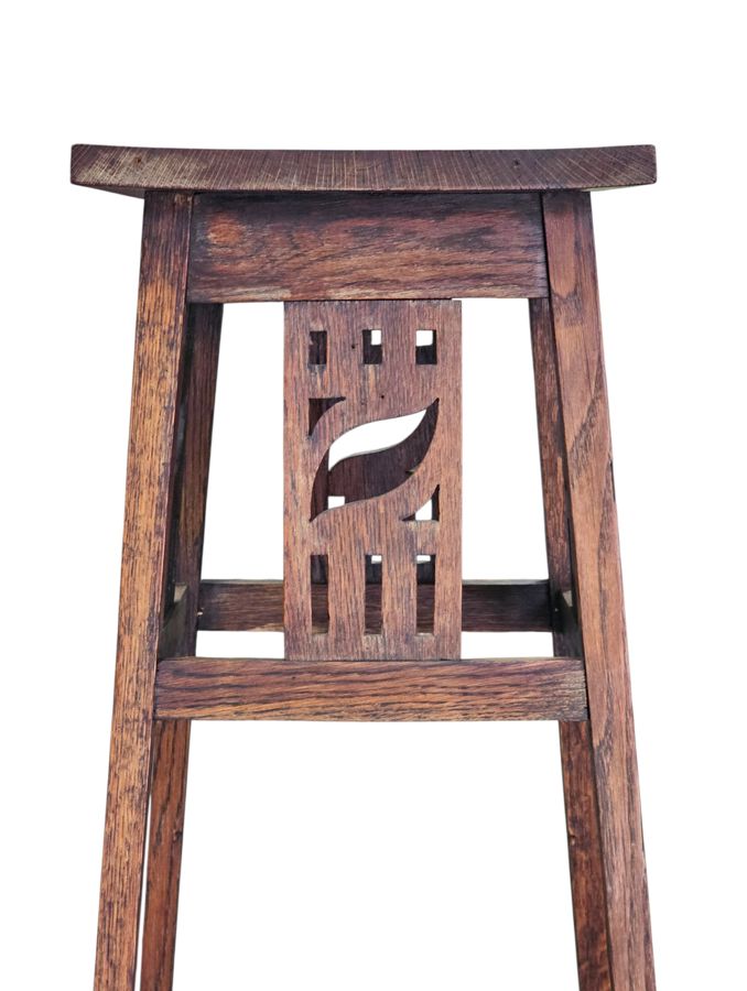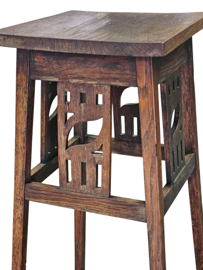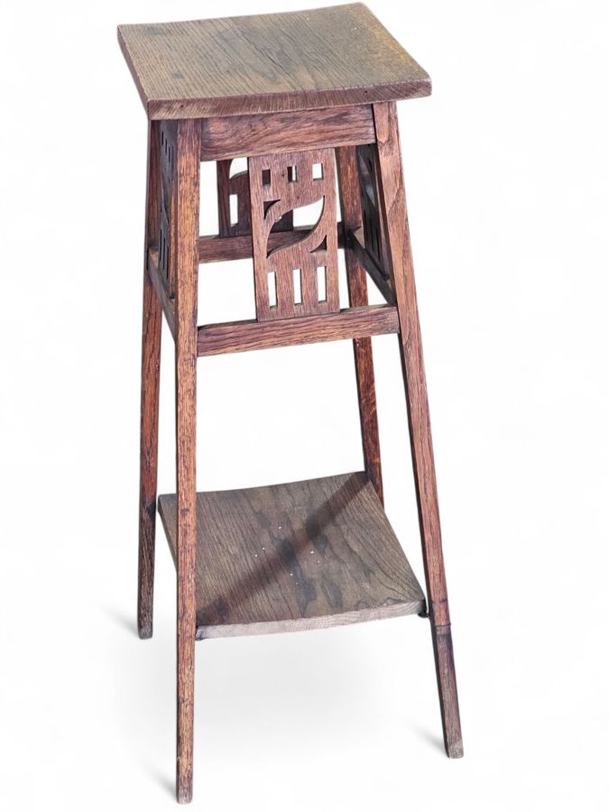 This stand, crafted from oak, features the clean lines and simple, geometric cutout designs characteristic of the Arts and Crafts movement.