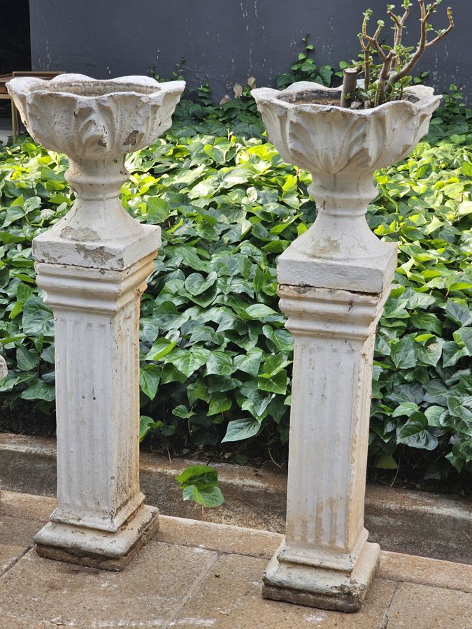 This lot features a pair of classic garden ornaments, each with a flared, ribbed urn/Planter on a fluted columnar pedestal.