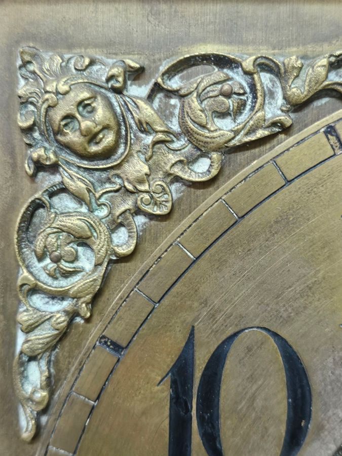 This elegant timepiece features a square brass dial, ornate carved columns on the hood, and a viewing window on the trunk.
