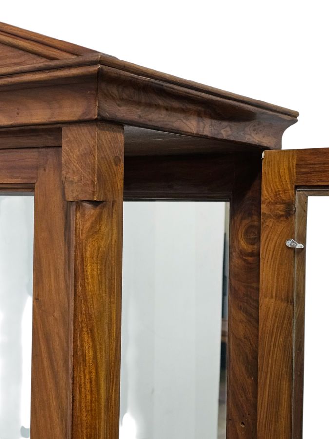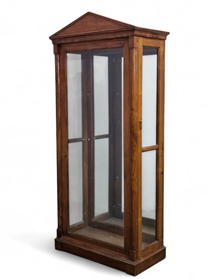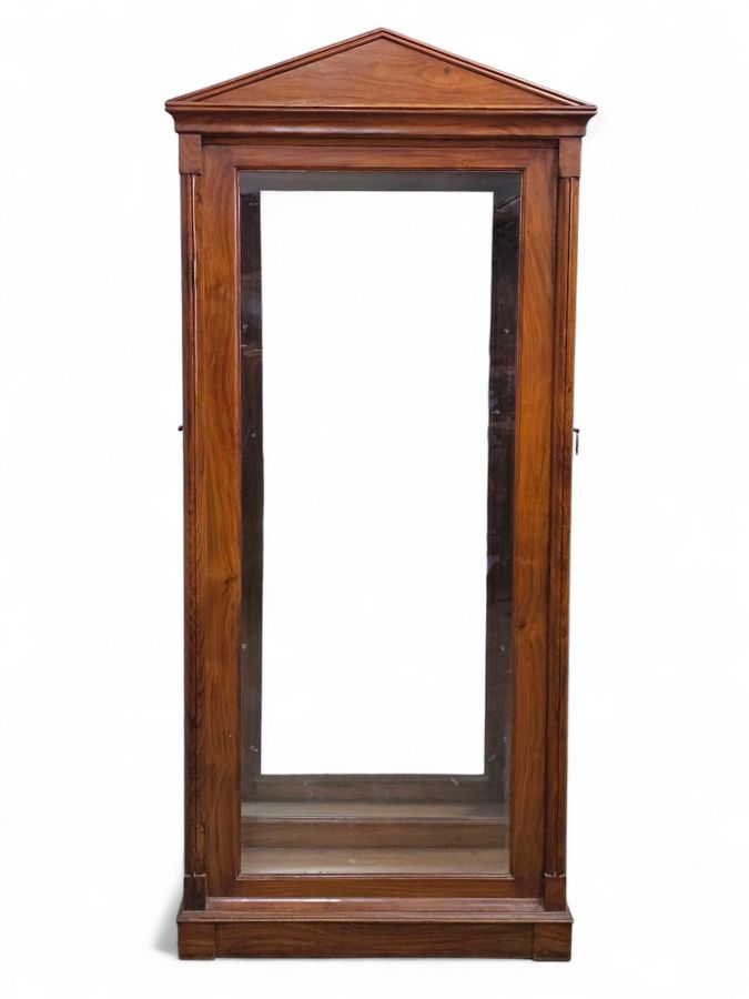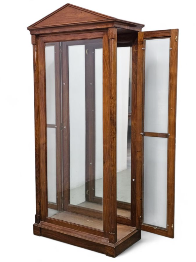 This piece features a central section with a arch pediment, flanked by two side display cabinets, each with a single glazed door. The cabinet has a dark wood finish and is a floor-standing unit, suitable for showcasing items in a shop, museum, or home. 81cm(w) x 40cm(d) x 181cm(h)