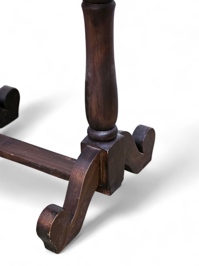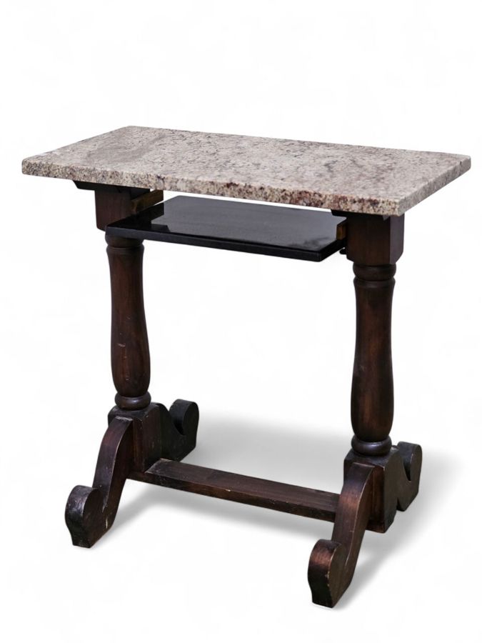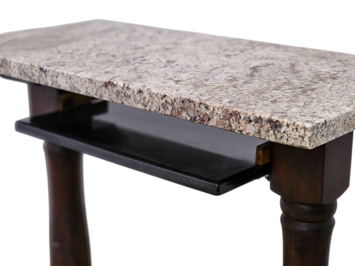 This small, elegant table features a rectangular granite slab top and a dark-finished, carved wooden base with turned legs.
