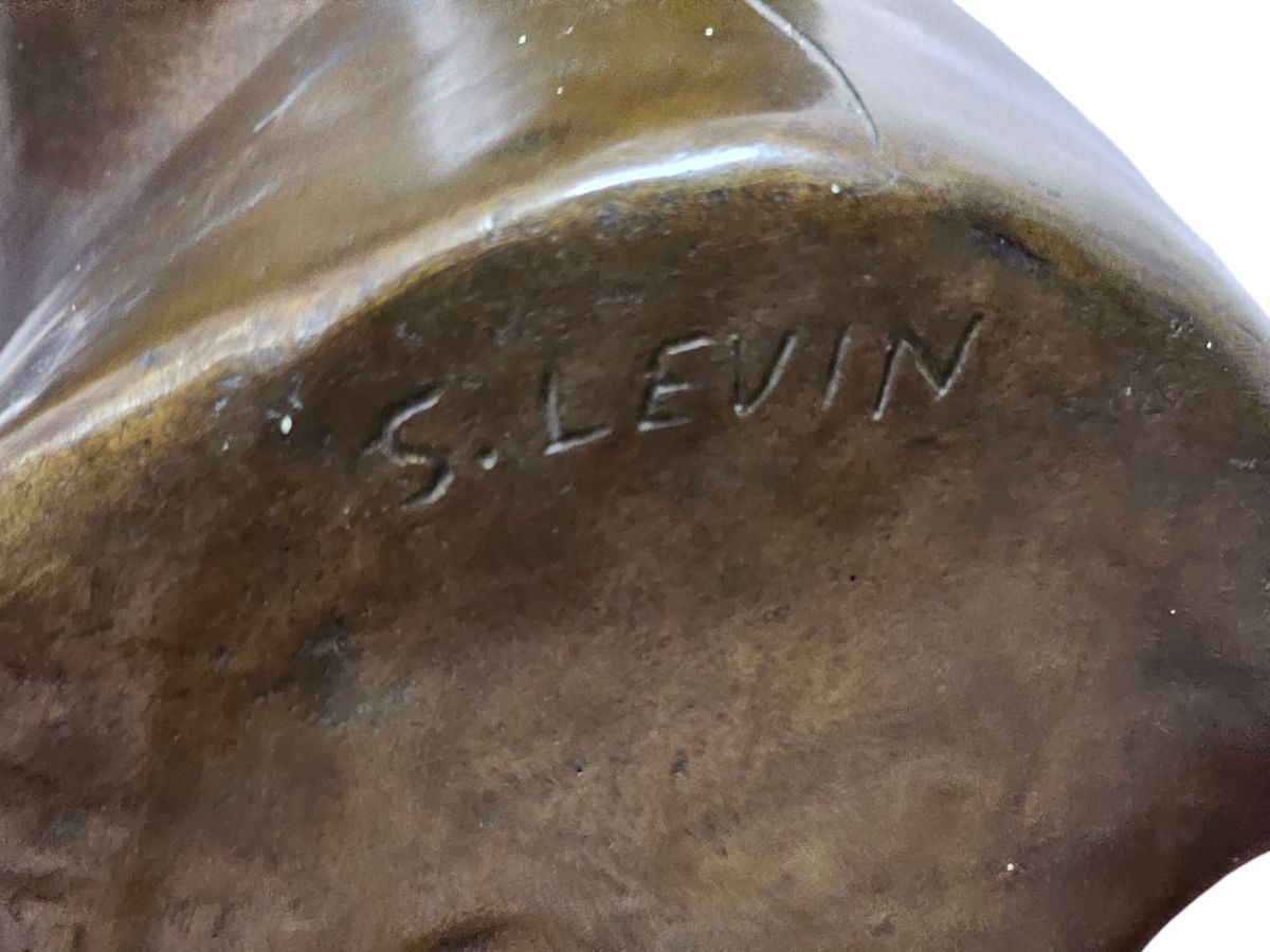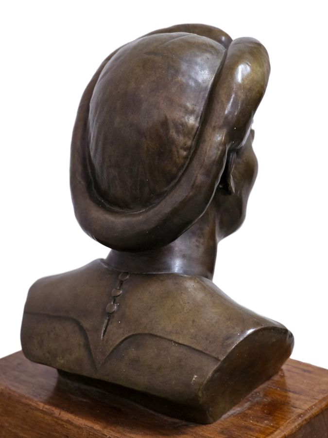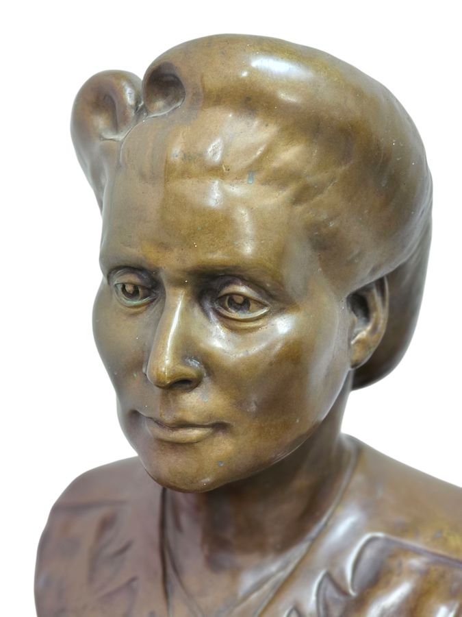 This is a bronze bust of Marie Curie mounted on a wooden pedestal.