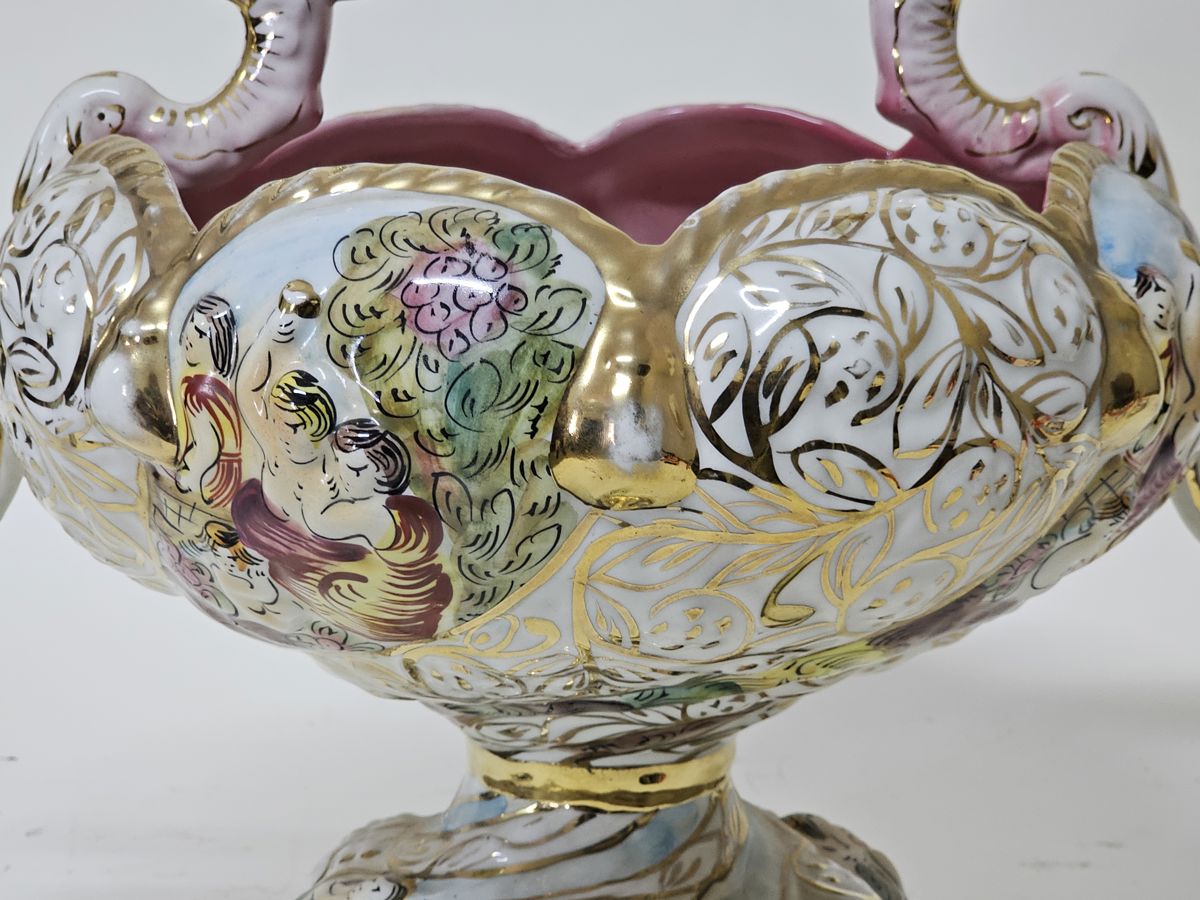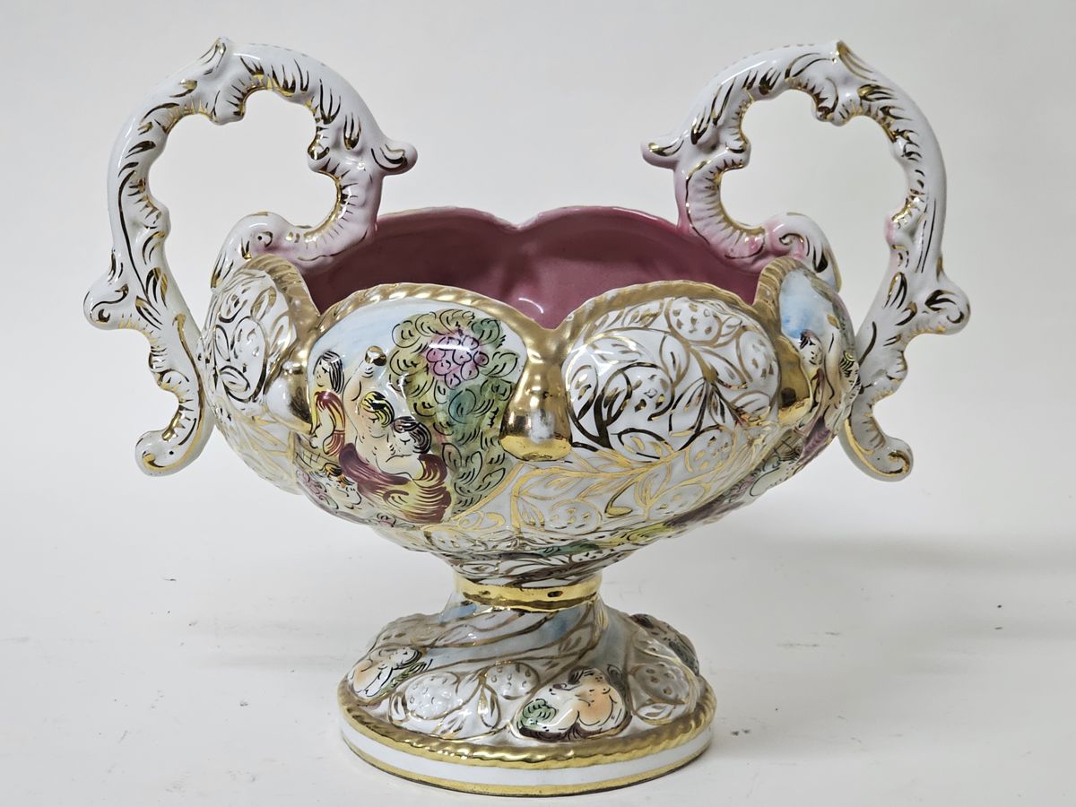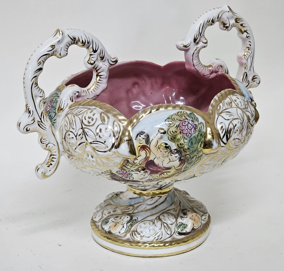 A Capodimonte porcelain centerpiece bowl on a pedestal base with intricate, figural handles.