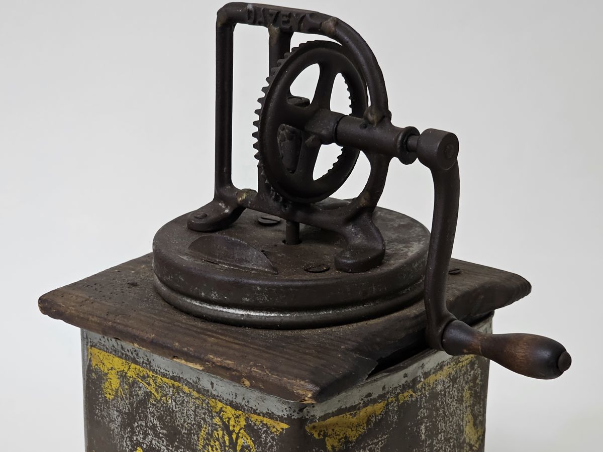 The churn features a cast iron crank and gear mechanism, with a wooden handle.