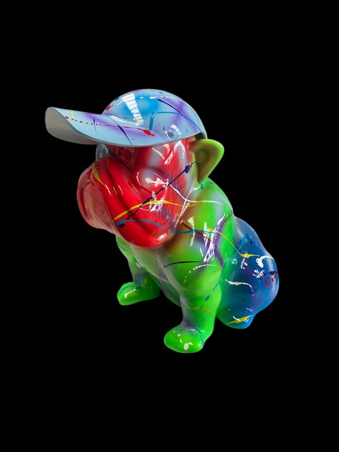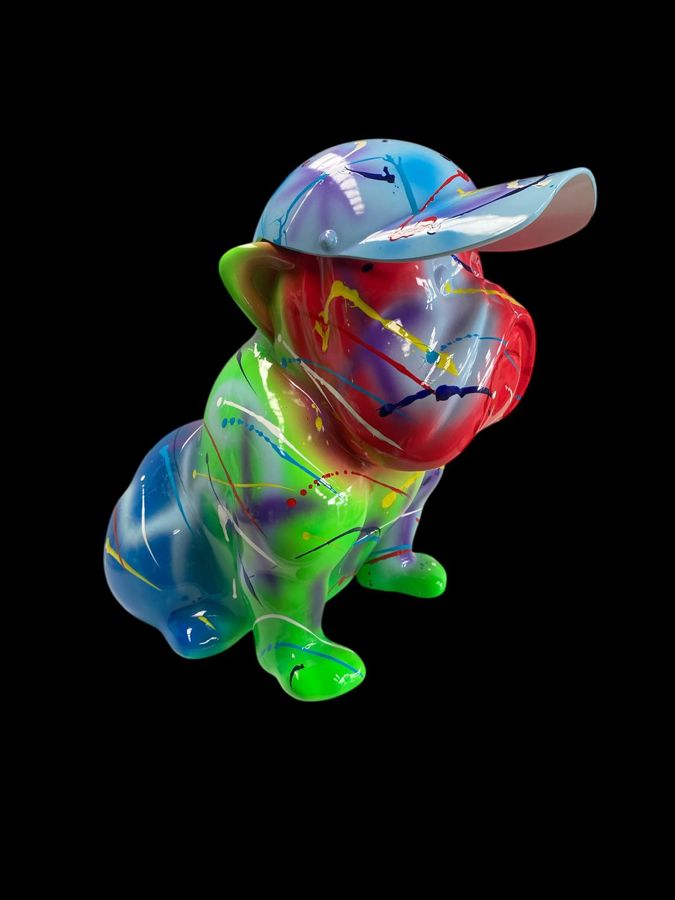 Een indrukwekkend Pop Art sculptuur van de 'Cobra Art Company' uit Amsterdam. Dit werk, een 'Graffiti Bulldog' met pet, is een perfect voorbeeld van moderne, speelse 'Street Art' voor in het interieur. De levendige 'splash'-kleuren (rood, groen, blauw) zijn aangebracht op een basis van hoogglans resin - Het formaat van 40 cm maakt dit een substantieel 'statement piece'. Het bijbehorende certificaat van echtheid is cruciaal en bevestigt de herkomst en authenticiteit van deze officiële Cobra Art editie - Hoogte ca. 40 cm, Lengte ca. 30 cm, Breedte ca. 23 cm