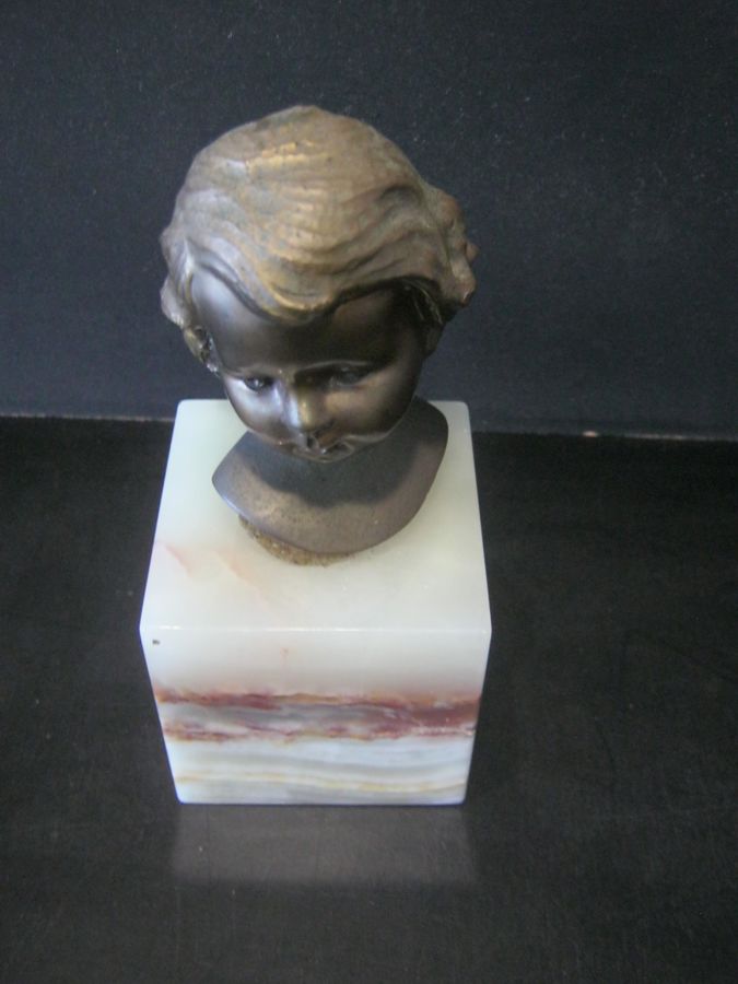 CAST BRONZE OF CHILD'S HEAD ON ONYX PEDESTAL BASE, 17cm Tall