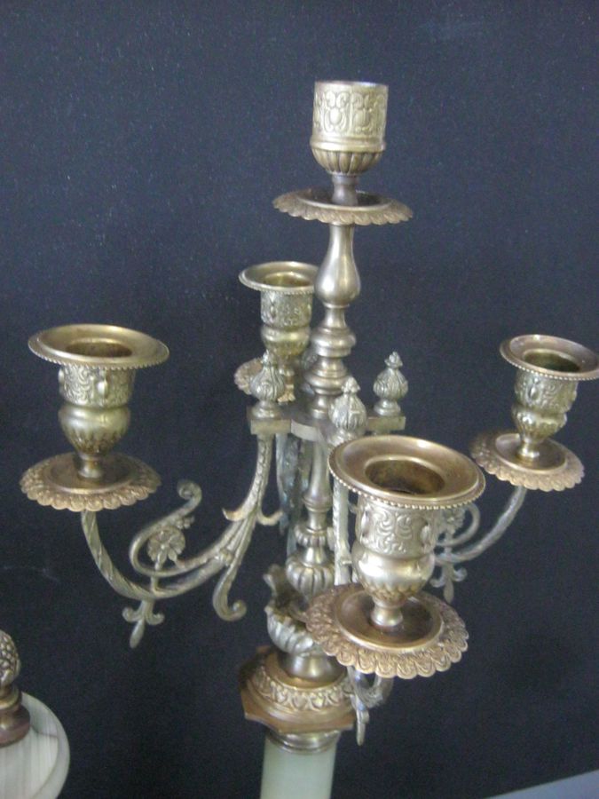 19thC GREEN ONYX AND GILT BRONZE GARNITURE SET, Louis XVI Style Clock and Pair of 5 Arm Candelabra, Working Clock with Key, Height of Clock 47cm, Height of Candelabra 51cm